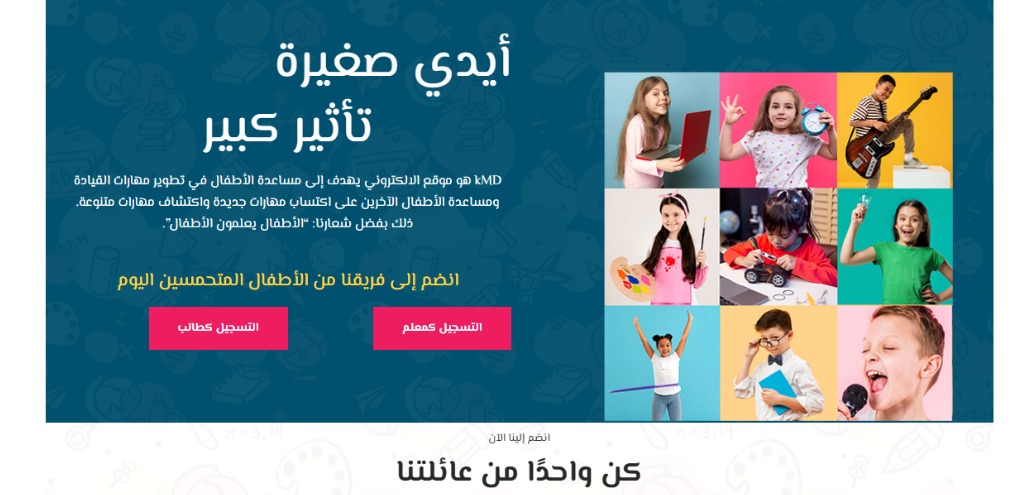 موقع KMD منصة تهدف إلى دعم الأطفال في تطوير مهارات القيادة وتنمية قدراتهم على اكتساب مهارات جديدة واكتشاف اهتمامات متنوعة، ضمن تجربة موجهة للطفل والأسرة. يوفّر الموقع مسارات واضحة للانضمام عبر أزرار تسجيل كطالب وتسجيل كمعلم، بما يساعد على بناء مجتمع تعليمي يجمع بين المتعلمين والمدربين لتقديم محتوى يركز على تنمية الطفل عمليًا.