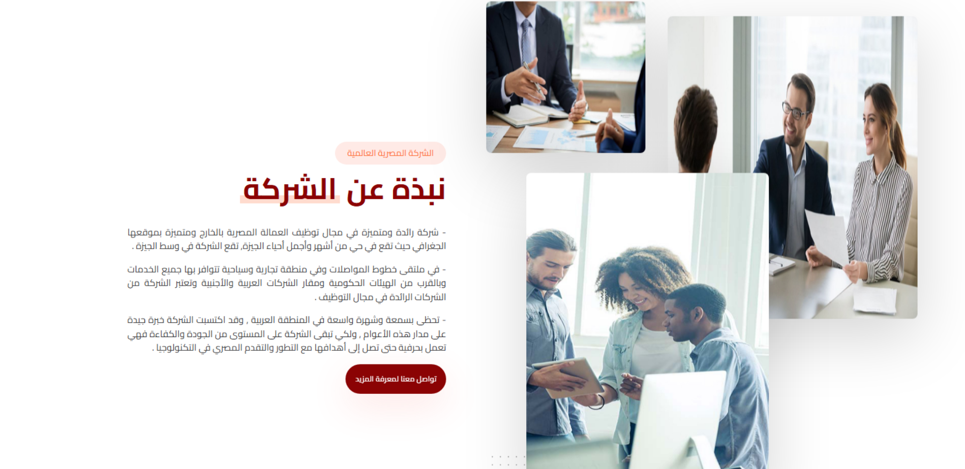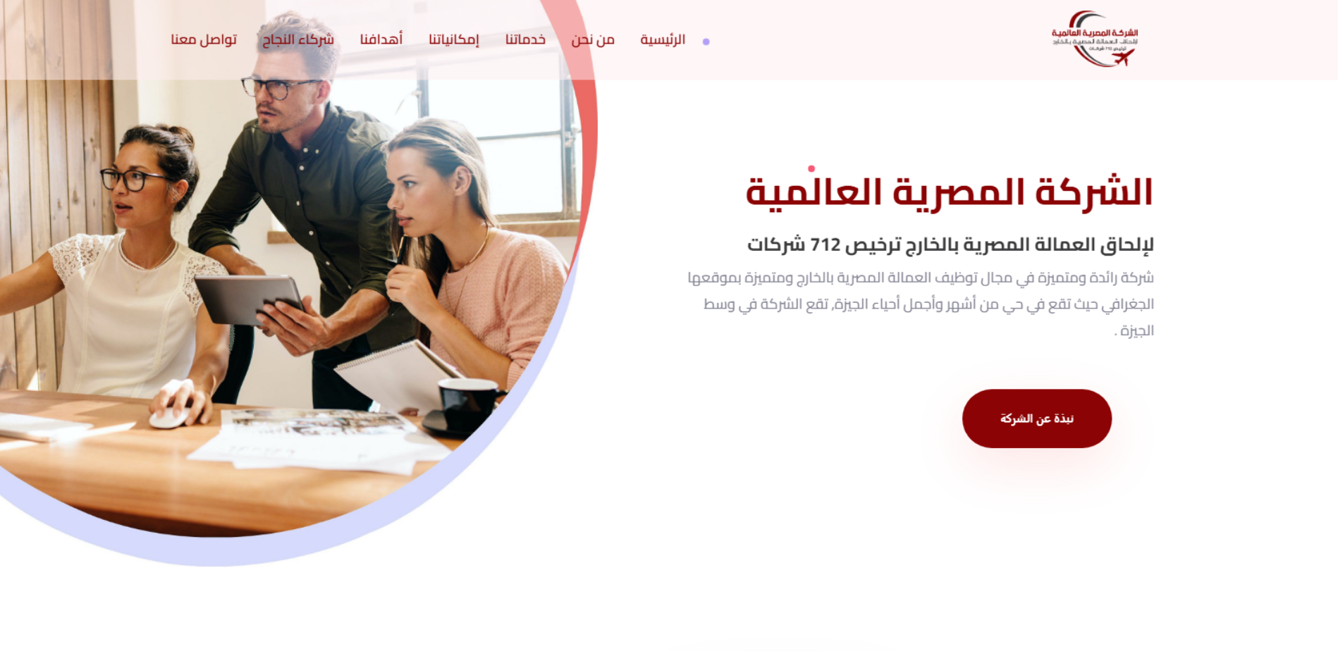 موقع الشركة المصرية العالمية يوضح نشاطها في توظيف العمالة المصرية بالخارج عبر ترشيح الكفاءات (أطباء/صيادلة/مهندسين/محاسبين/مدرسين وعمّال مهنيين وحرفيين) وإجراء وتنظيم مقابلات التوظيف، مع إبراز امتلاك قاعات مجهزة وإمكانية عمل المقابلات عبر الإنترنت لتسهيل التوظيف لأصحاب العمل خارج البلاد، بالإضافة لعرض أهداف الشركة وقسم “شركاء النجاح” ومعلومات الاتصال.