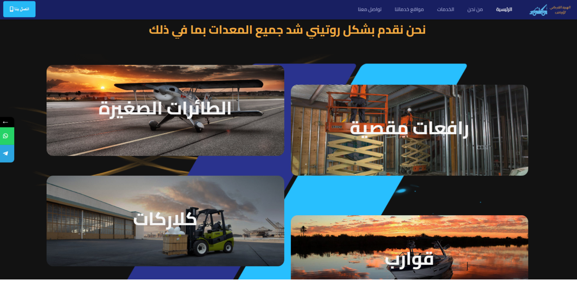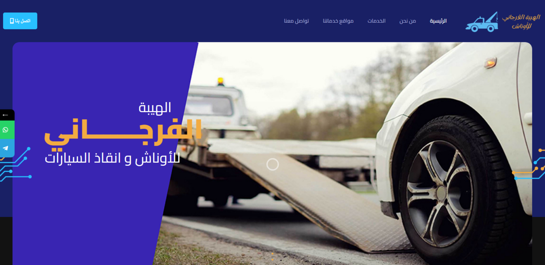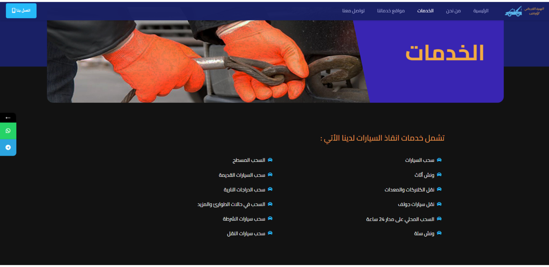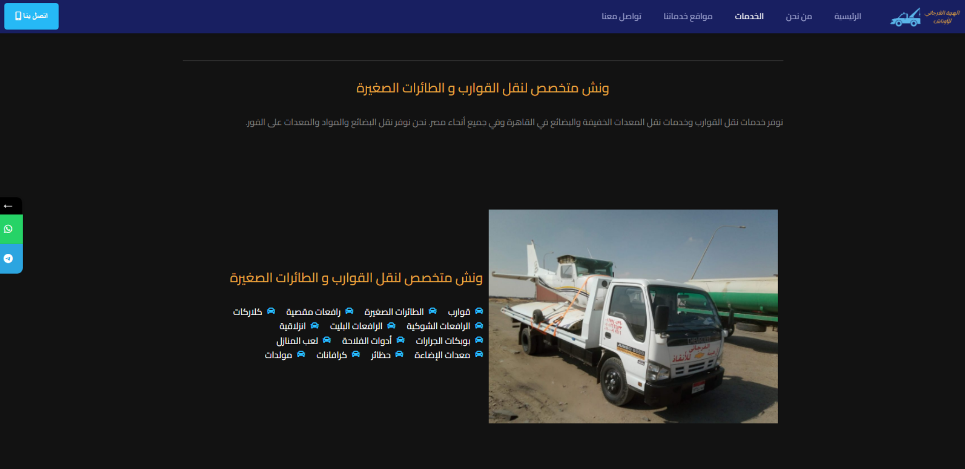 موقع تعريفي لخدمة إنقاذ وسحب السيارات يعمل 24 ساعة طوال الأسبوع، يوضح الخدمات الأساسية مثل سحب السيارات، السحب المسطح/الخفيف، سحب الدراجات النارية، سحب سيارات نقل وشرطة، ونش أثاث، ونقل كلاركات ومعدات، مع نطاق خدمة يشمل محافظات متعددة داخل مصر وبيانات تواصل.