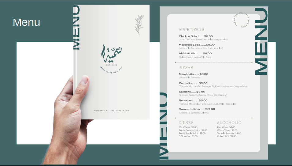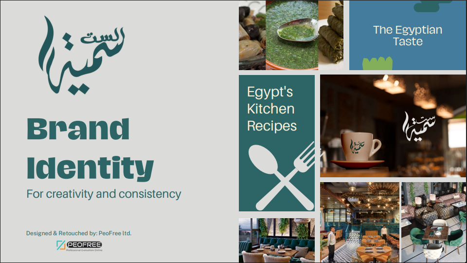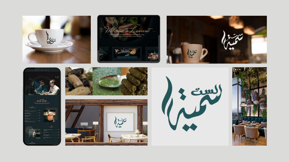 الست سمية براند مطعم/مطبخ بهوية تجمع بين الطابع المصري ولمسة عصرية. الهوية مبنية على شعار عربي واضح واستخدام ألوان هادئة، مع تطبيقات جاهزة للاستخدام مثل المنيو، وبطاقات العمل، وتطبيقات على المنتجات والملابس، بالإضافة إلى تصوّر لتصميم المكان ومظهره العام.