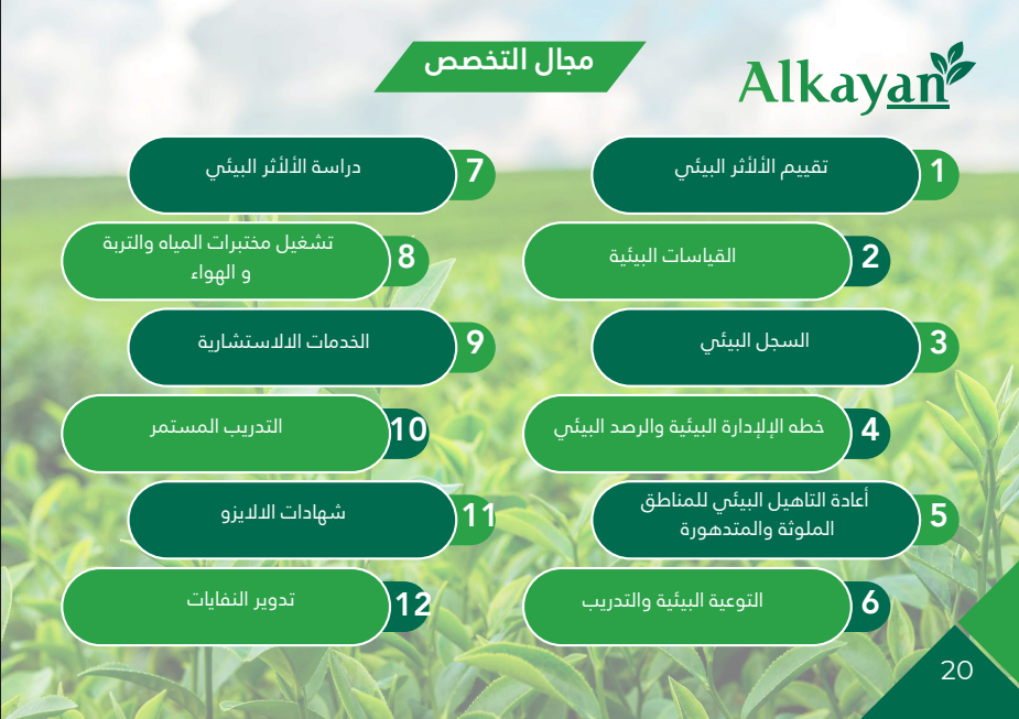 الكيان الأمثل (Alkyan) شركة سعودية متخصصة في الخدمات البيئية والاستشارات الزراعية والبيئية والبيئة البحرية، وتعمل بفريق خبراء ومهندسين وفنيين. تقدم حلولًا تشمل دراسات وتقييم الأثر البيئي، القياسات والرصد، السجل البيئي وخطط الإدارة البيئية، إعادة التأهيل البيئي للمناطق المتدهورة، تشغيل مختبرات المياه والتربة والهواء، إضافة إلى خدمات الاستدامة البيئية والنمذجة والمسح البحري ورسم خرائط الموائل وخدمات مرتبطة بالمشاريع الساحلية (موانئ/تحلية/معالجة/طاقة/نفط وغاز).