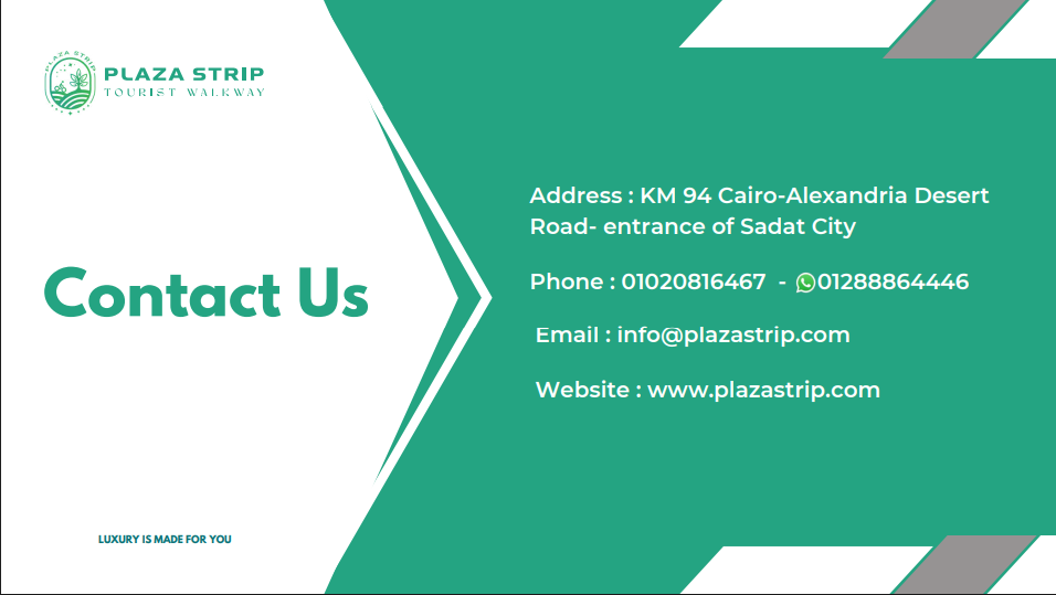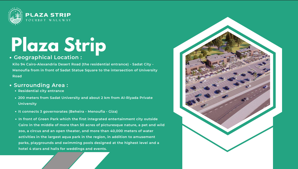 Plaza Strip مشروع عقاري/تجاري ترفيهي على طريق القاهرة–الإسكندرية الصحراوي عند مدخل مدينة السادات – المنوفية. يقدّم ممشى سياحي بمكونات ترفيهية وتجارية تشمل مطاعم وكافيهات ومعارض، ومساحات خارجية لكل وحدة، مع مسار مخصص للدراجات والسكوتر، ومنطقة للأطفال، ومساحات انتظار سيارات بأنظمة أمان حديثة. الملف يوضح أن المشروع يمتد على 8 أفدنة (35,000 م²) وعلى مرحلتين.
