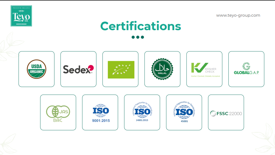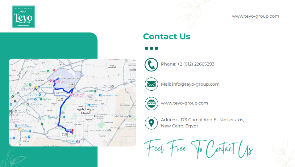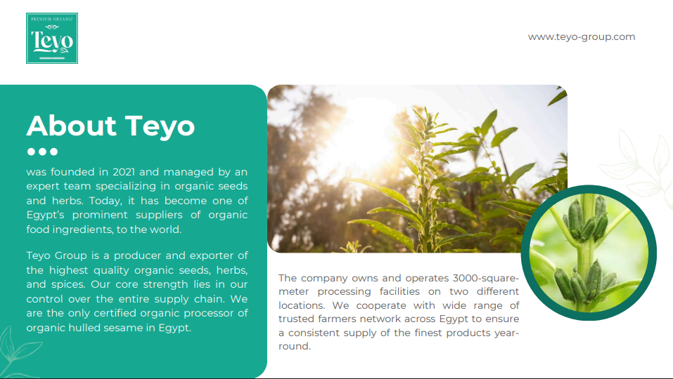 تيو جروب شركة مصرية متخصصة في إنتاج وتصدير البذور والأعشاب والتوابل العضوية. تمتلك وتشغّل منشآت تجهيز ومعالجة بمساحات تشغيلية على موقعين، وتتعاون مع شبكة مزارعين داخل مصر لضمان توريد منتظم على مدار العام. من نقاط تميزها قدرتها على التحكم في مراحل سلسلة التوريد بالكامل، وكونها جهة معتمدة في معالجة بعض منتجات السمسم العضوي المقشور داخل مصر، مع الالتزام بمعايير جودة واختبارات وفحص للمنتجات قبل التصدير.