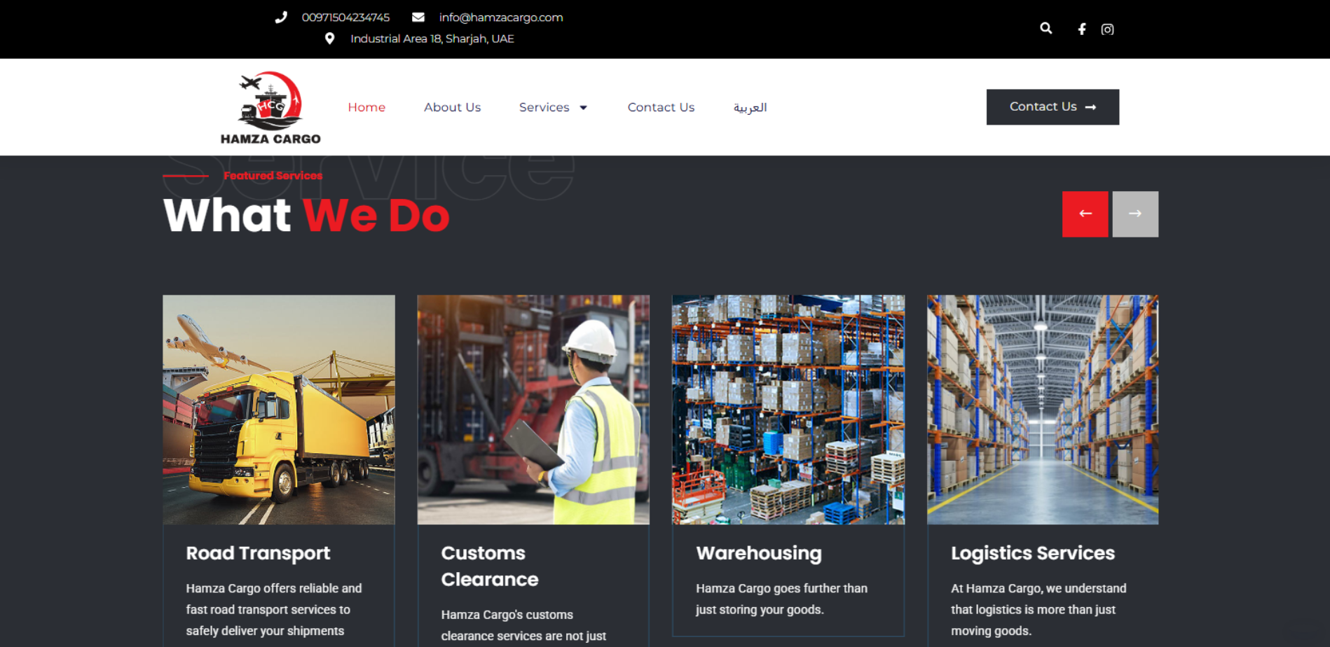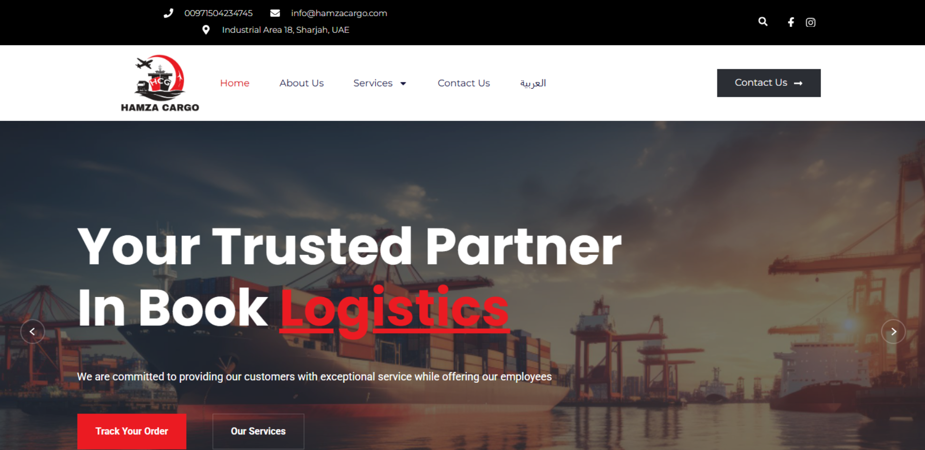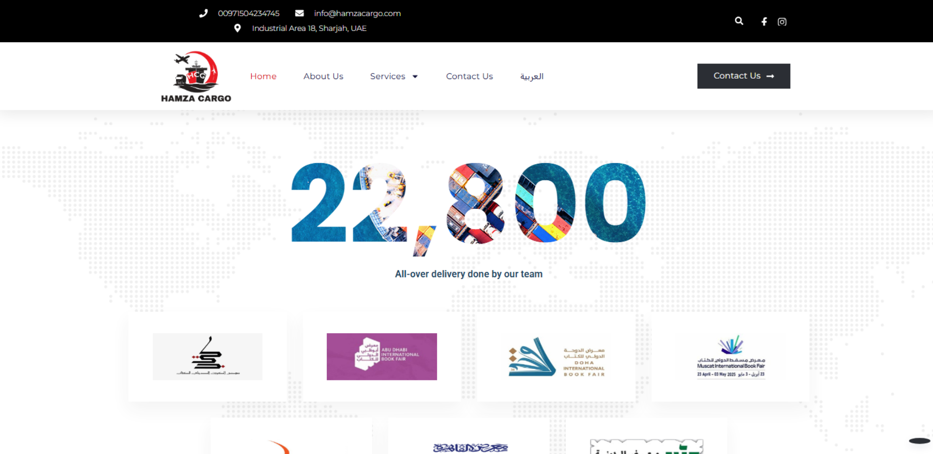 موقع حمزة للشحن الدولي يقدّم نظرة عن خدمات الشركة في الشحن الدولي انطلاقًا من الإمارات، مع عرض حلول الشحن البري والبحري والجوي وخدمة التخليص الجمركي، وإشارات لاستخدامات واضحة مثل شحن إصدارات الكتب للناشرين والمشاركات في المعارض، بالإضافة لبيانات التواصل. كما تظهر إشارات لتواجد/نقاط خدمة داخل الإمارات (مثل الشارقة ودبي).