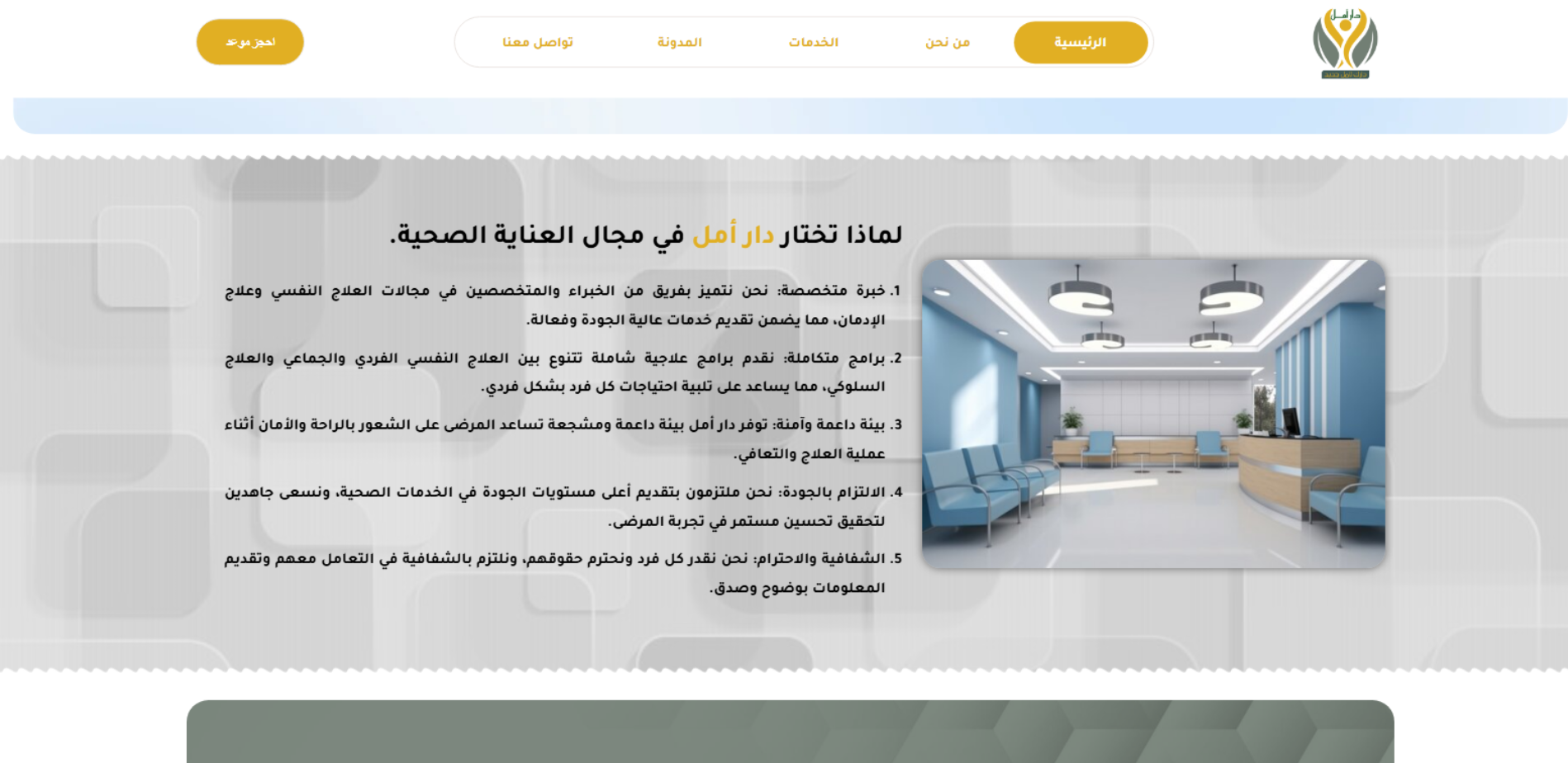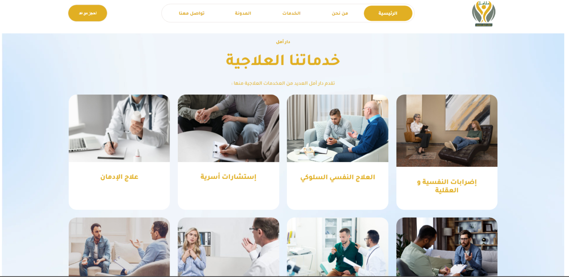 دار أمل مركز/مستشفى يقدم رعاية متخصصة في الصحة النفسية وعلاج الإدمان عبر برامج علاجية شاملة تشمل التقييم الطبي-النفسي-الاجتماعي ووضع خطة علاج مناسبة للعيادات الخارجية أو الحالات المقيمة، مع تركيز على بيئة علاج آمنة وفريق متعدد التخصصات، بالإضافة إلى قسم مدونة للتوعية.