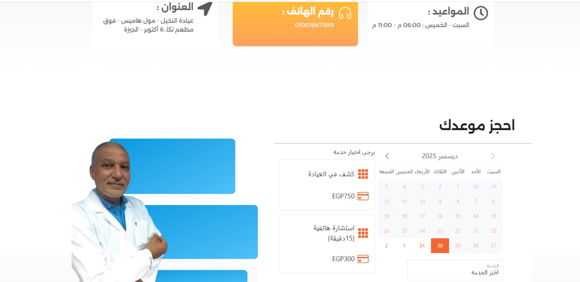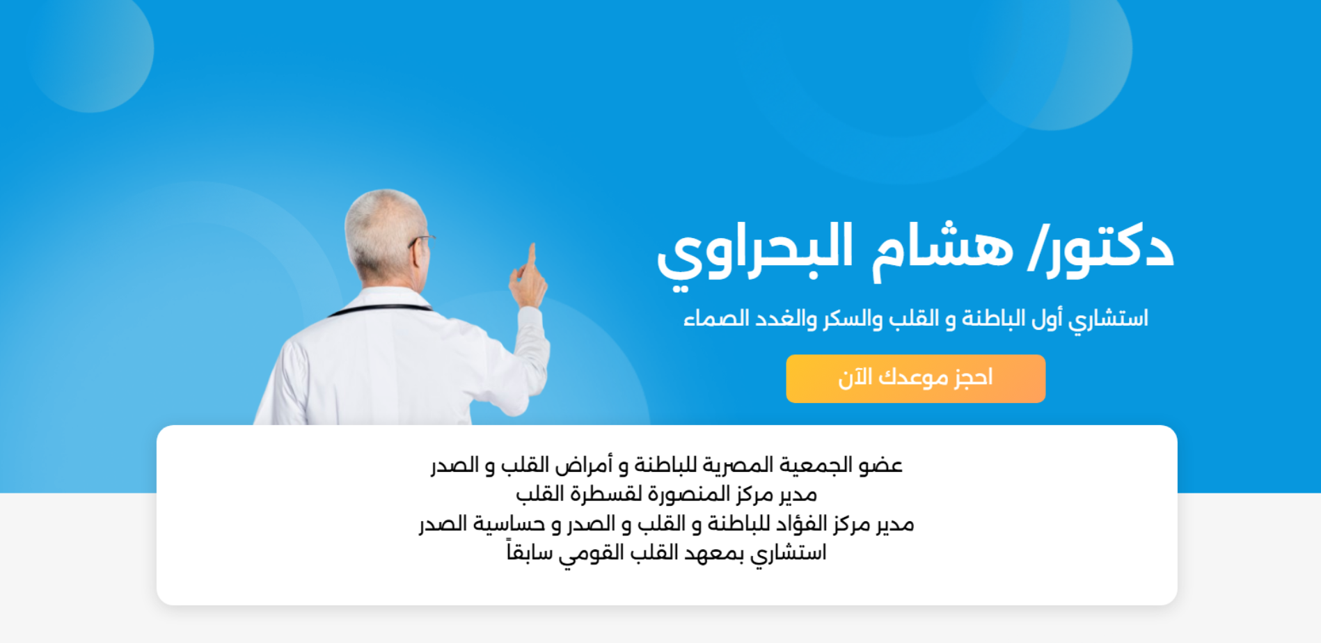 موقع رسمي لطبيب متخصص (استشاري أول الباطنة والقلب والسكر والغدد الصماء) يعرض نبذة مهنية عن الطبيب، ويقدّم نظام حجز موعد لخدمات مثل كشف في العيادة أو استشارة هاتفية، بالإضافة إلى عرض مواعيد العمل ورقم الهاتف والعنوان في 6 أكتوبر – الجيزة وقسم لآراء المرضى.