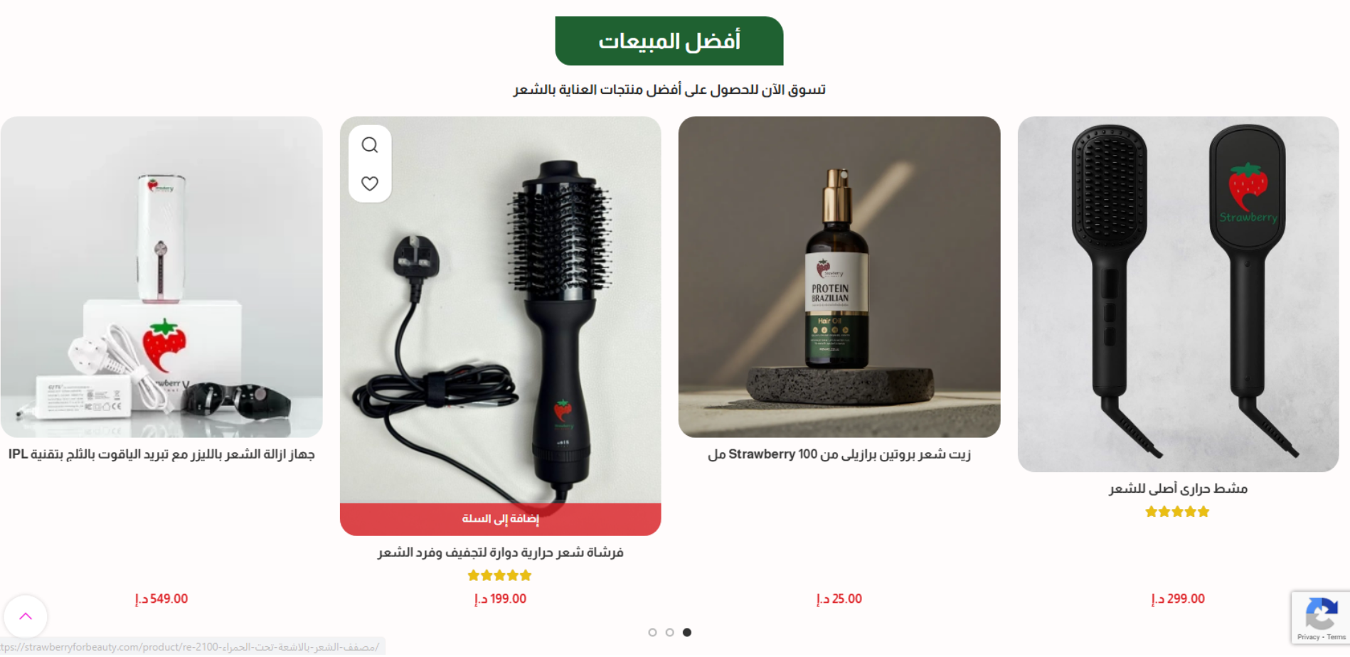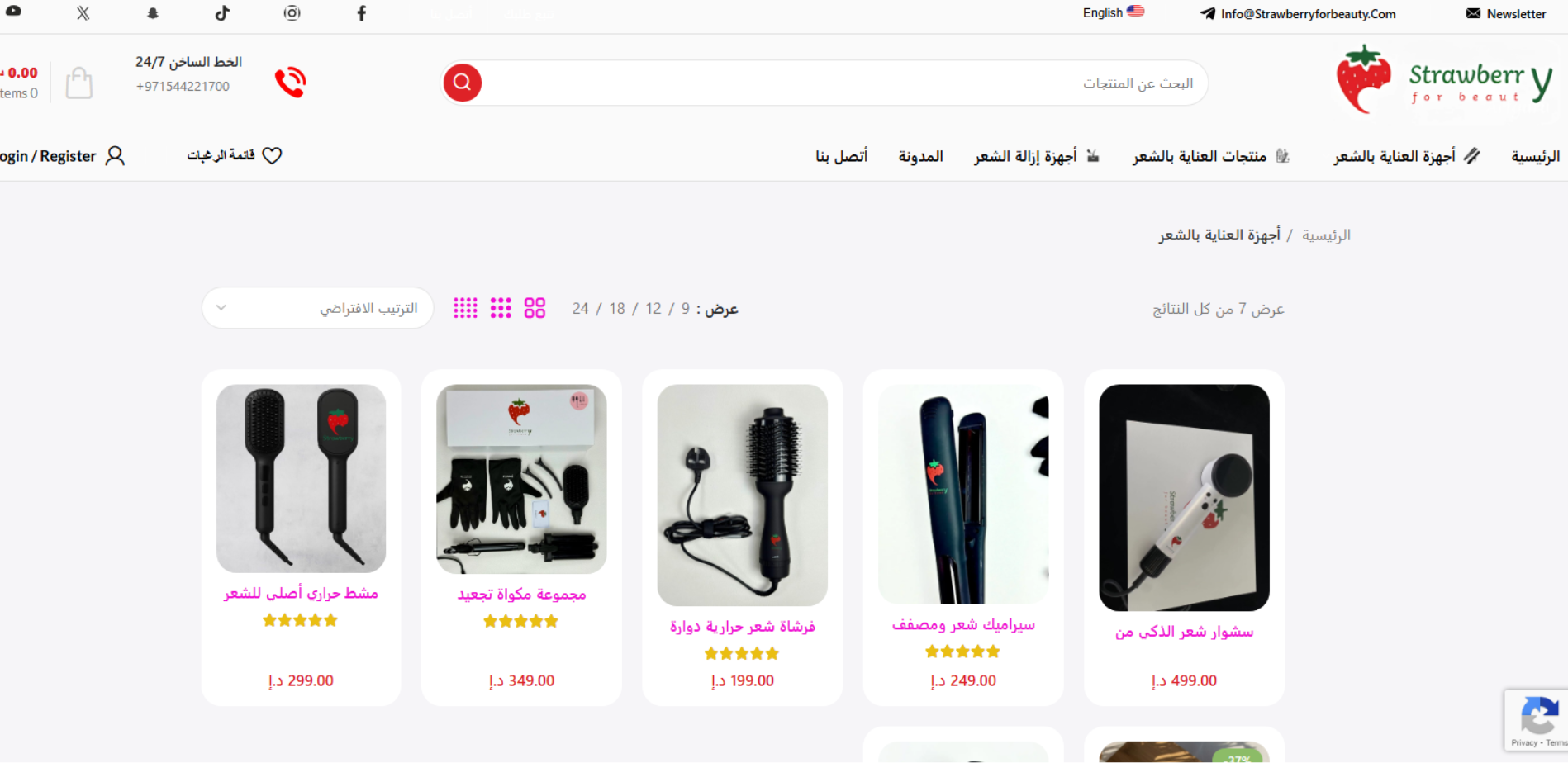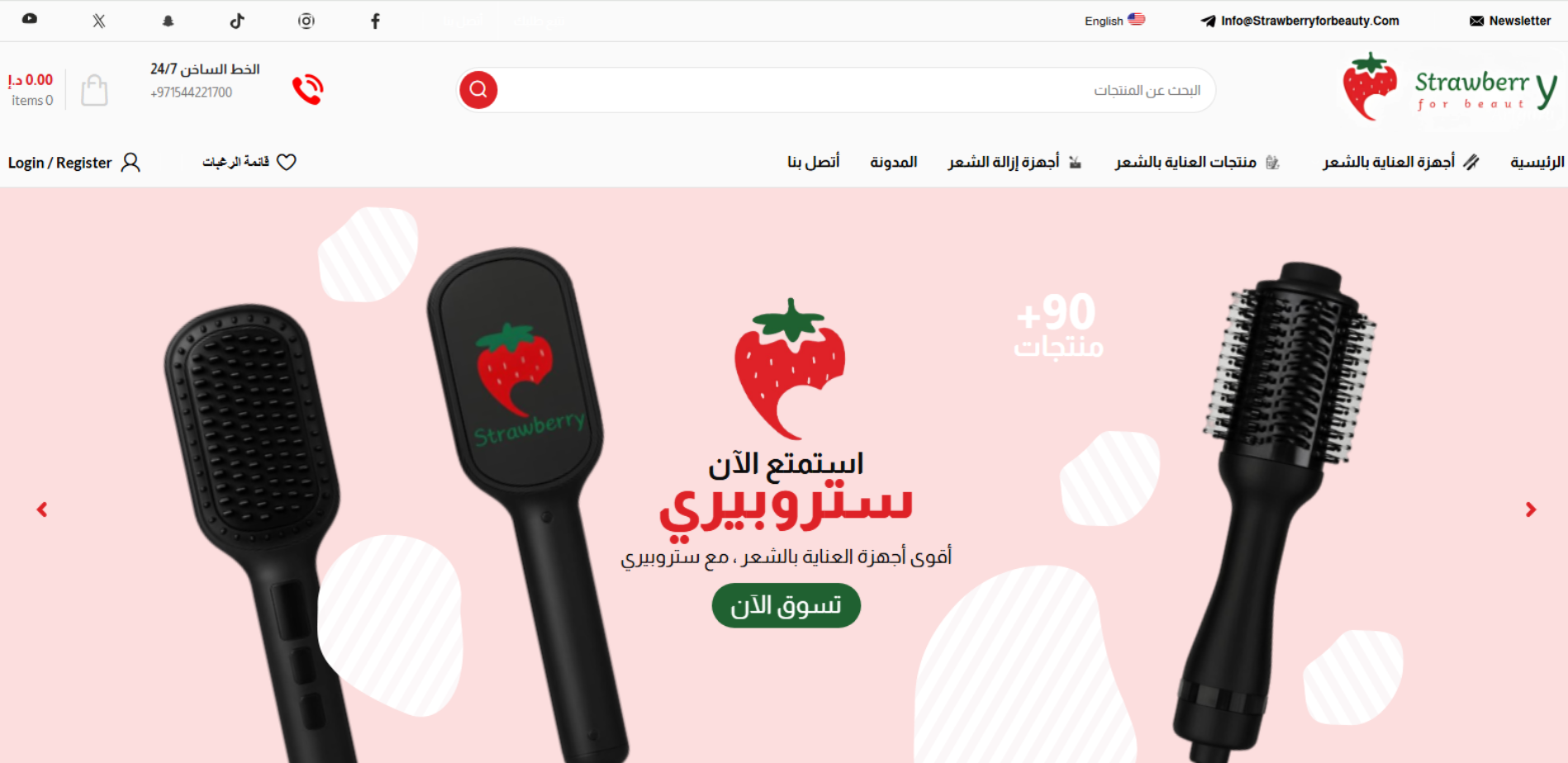 موقع Strawberry for Beauty منصة بيع أونلاين لأجهزة ومنتجات العناية بالشعر والبشرة؛ يضم كتالوج منتجات بفئات واضحة (أجهزة العناية بالشعر + منتجات العناية بالشعر + أجهزة إزالة الشعر)، مع خصائص متجر مثل Login/Register، قائمة رغبات، سلة شراء، وتتبع الطلب وصفحة مدونة وتواصل.