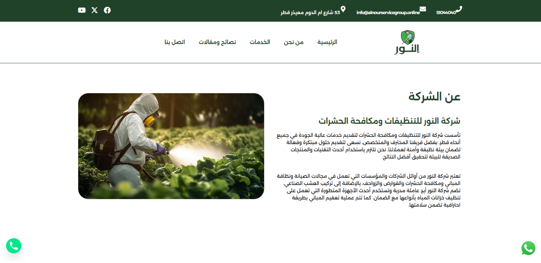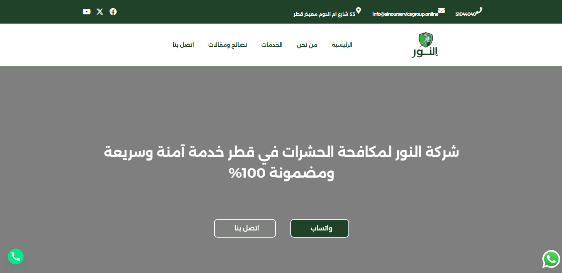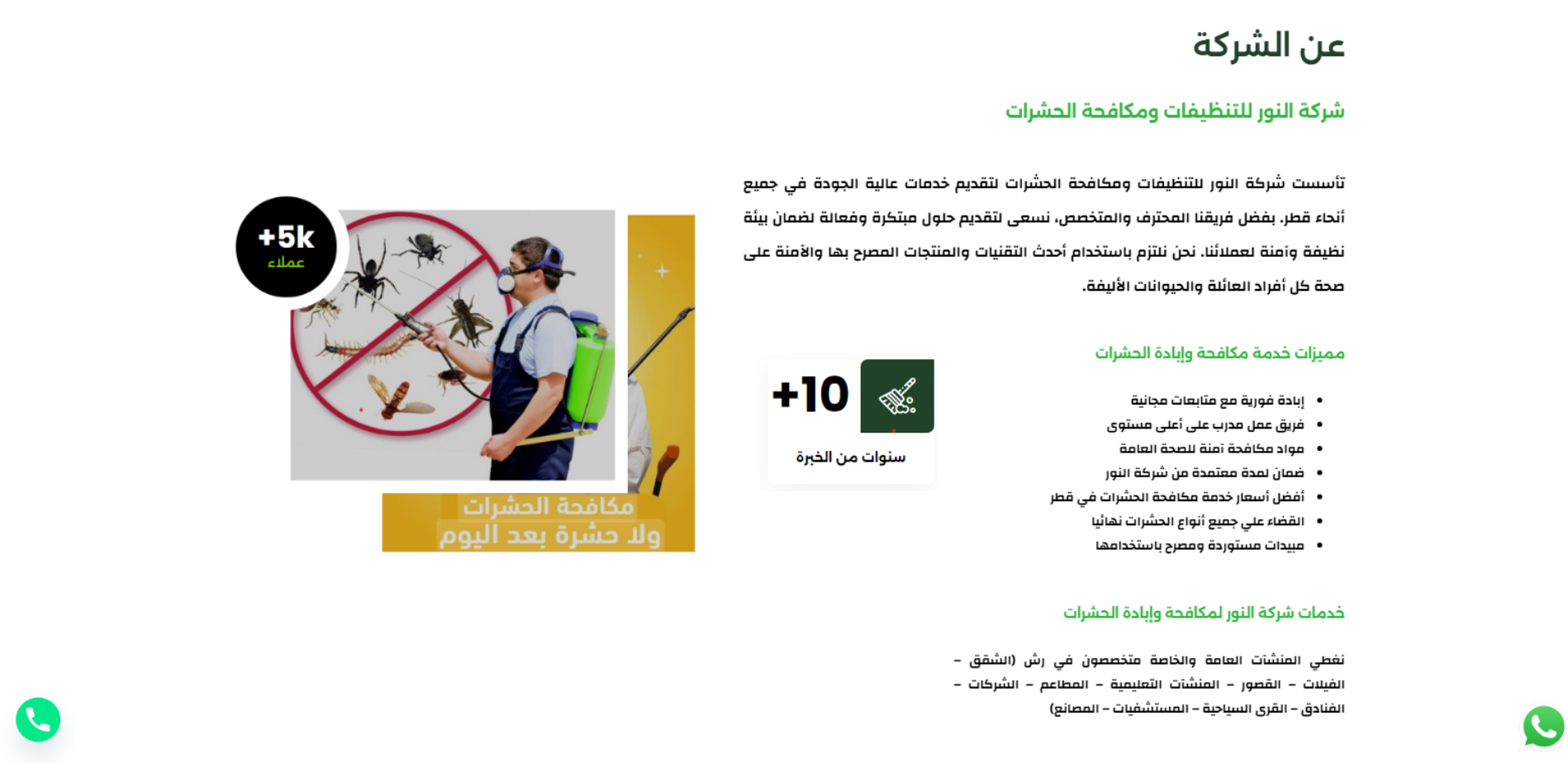 موقع تعريفي لشركة تعمل في قطر متخصصة في مكافحة وإبادة الحشرات والقوارض (مثل الصراصير والفئران والنمل/النمل الأبيض والبق والبرص…) ويذكر أيضًا خدمات مرتبطة بـ صيانة ونظافة وتعقيم المباني وتنظيف خزانات المياه، مع صفحات (من نحن/الخدمات/نصائح ومقالات/اتصل بنا) وبيانات تواصل.