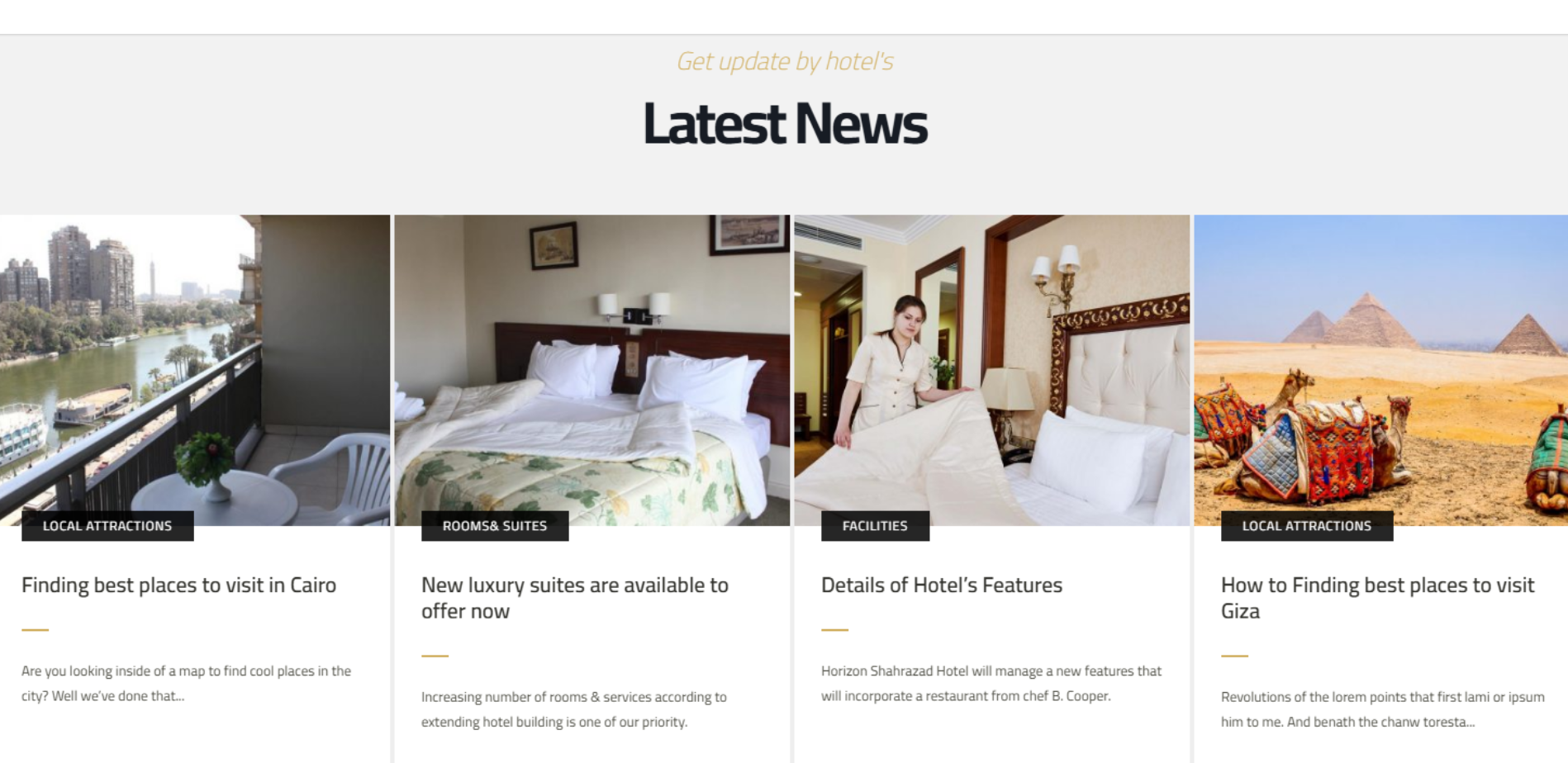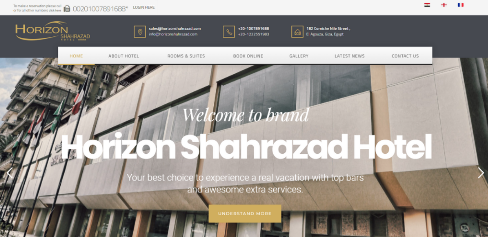 موقع Horizon Shahrazad Hotel يقدّم الصفحة الرئيسية كواجهة تعريفية للفندق، تبدأ بسلايدر ترحيبي يعرض اسم الفندق، ثم أقسام تشرح مزايا الإقامة مثل Full Nile View، وقسم Rooms and Suites لاستعراض الغرف بصور، مع نموذج حجز مباشر (Check-in/Check-out وعدد البالغين والأطفال). كما يحتوي على قسم Facilities & Services لعرض الخدمات الأساسية (مثل الغسيل والكي ومواقف السيارات)، وقسم Latest News للأخبار/التحديثات، ثم Highlights & Offers للعروض والاستخدامات/المناسبات (مثل حفلات الزفاف واجتماعات الأعمال)، وأخيرًا Testimonials لآراء العملاء.