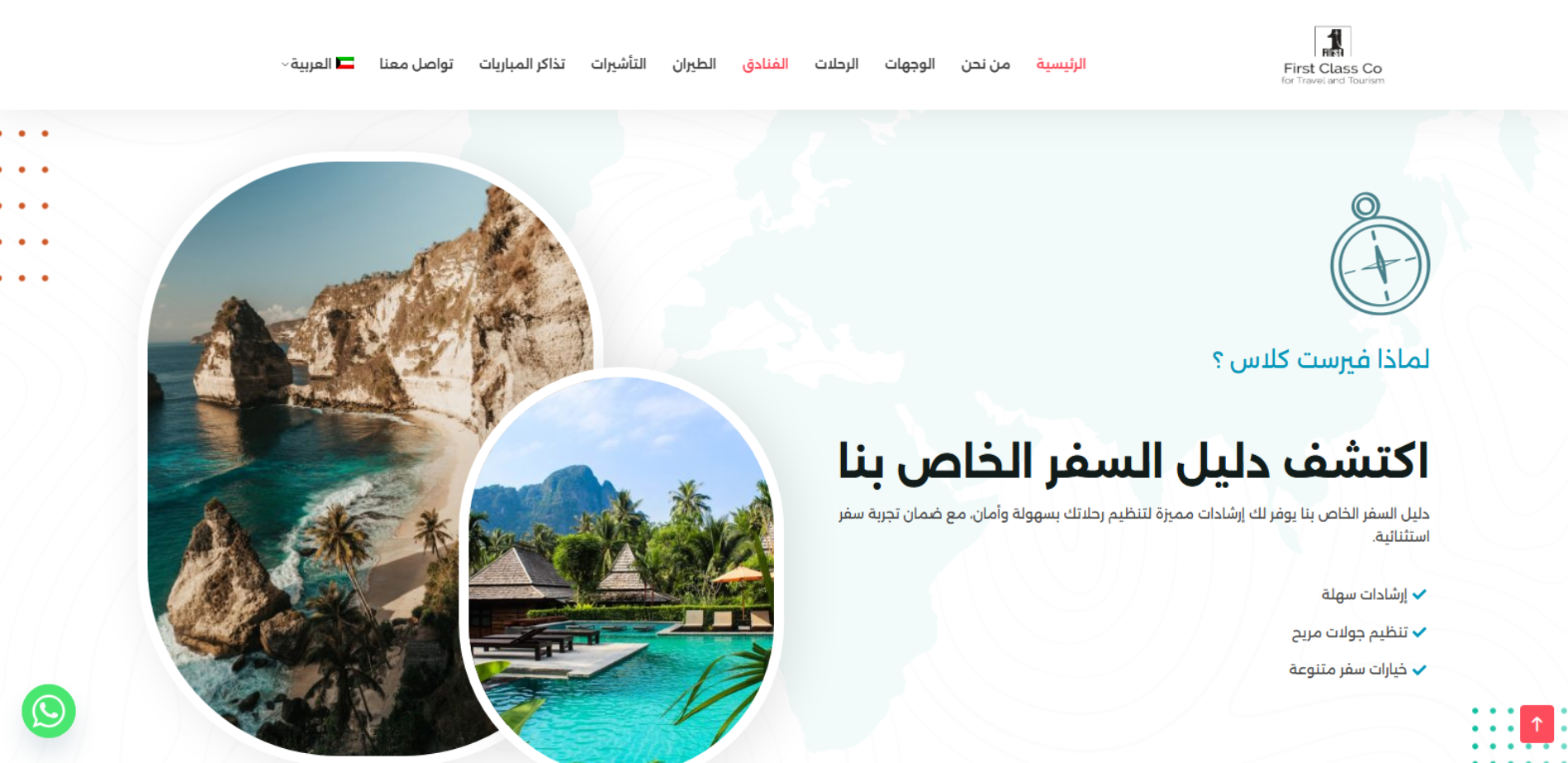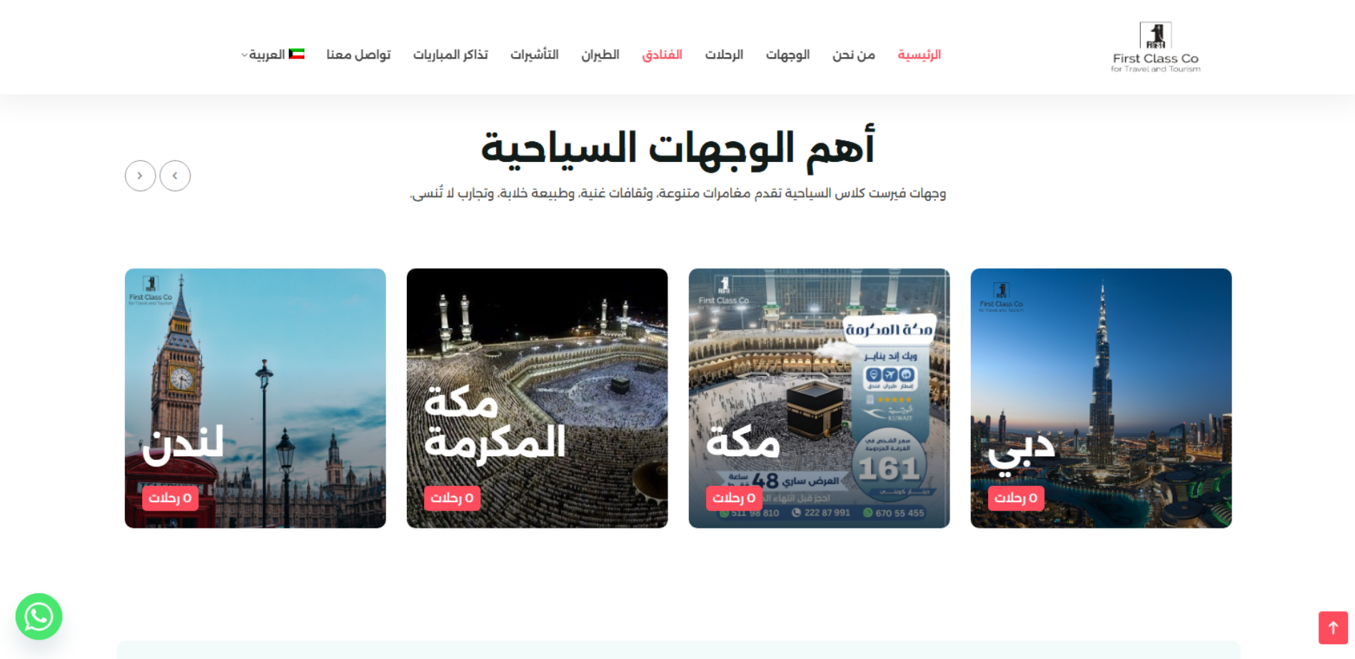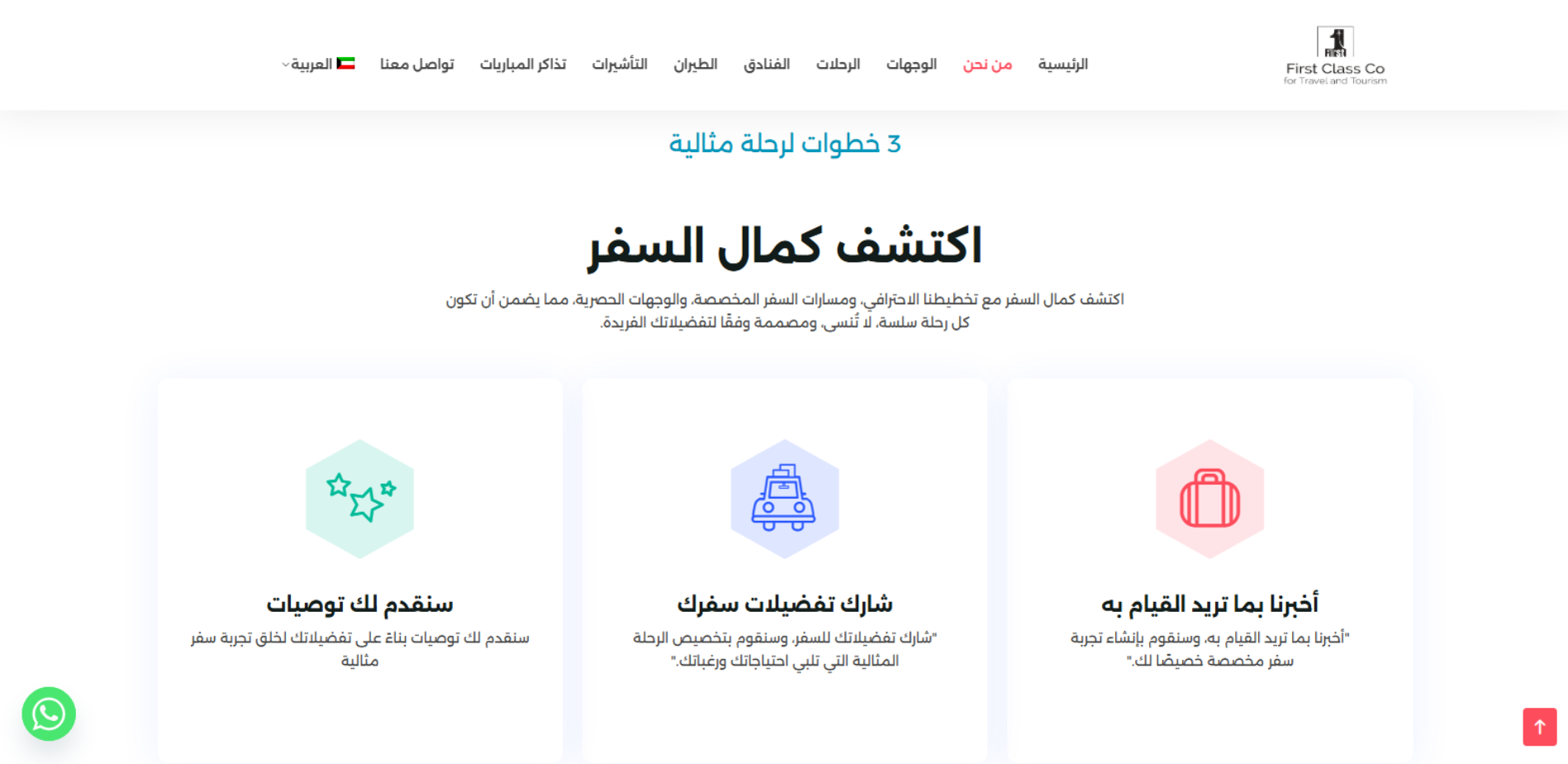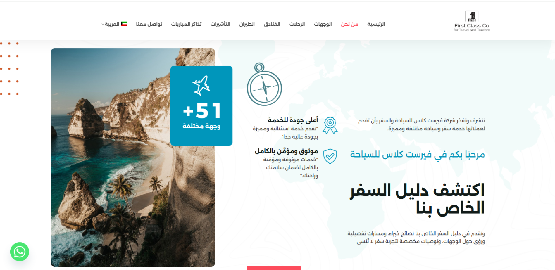First Class Q8 منصة لشركة سياحة تنشر بشكل دوري عروض ووجهات سياحية وتوضح أنشطتها (سفر ثقافي/مغامرات/استرخاء)، وتوفر خدمات أساسية مثل حجز الفنادق وتنظيم/تخطيط الرحلات وتجارب سفر “Tailored”، مع أقسام للدعم وسياسات الخصوصية وقنوات التواصل.