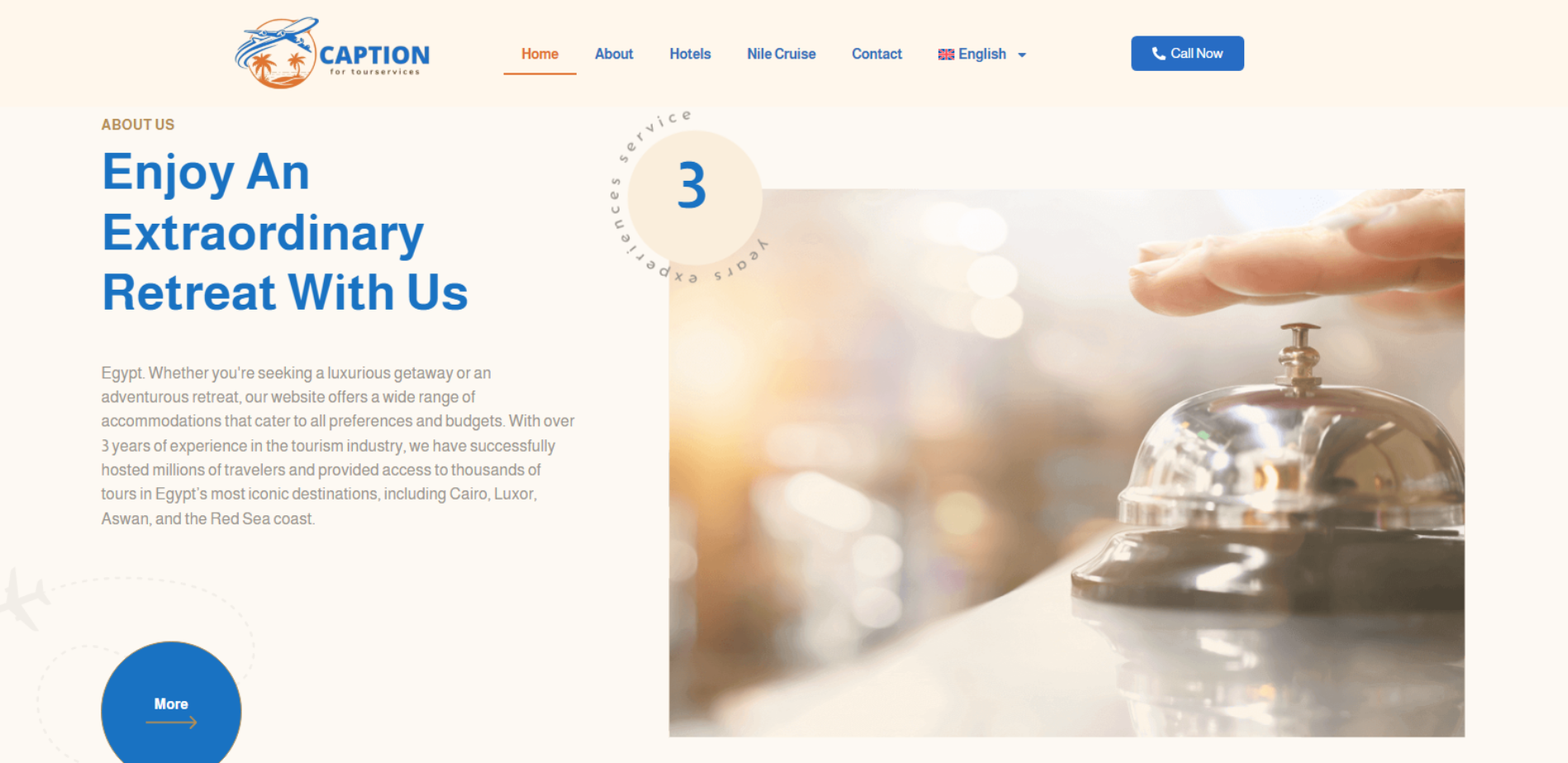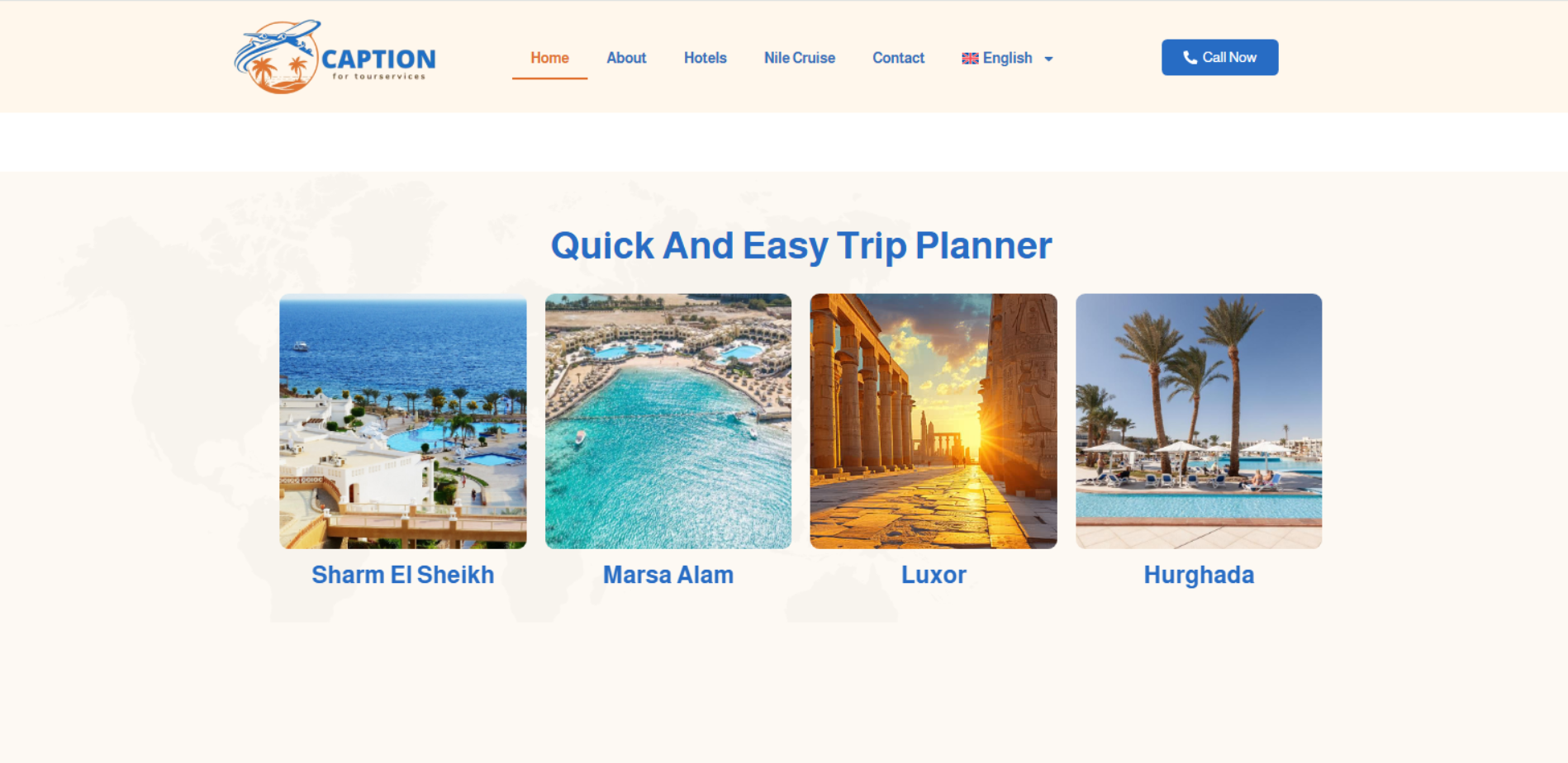 موقع Caption Tour Services يعمل كبوابة حجوزات سياحية: بحث واختيار فندق حسب المدينة والتواريخ وعدد الضيوف والغرف، مع صفحات تفاصيل للفنادق والأسعار، وقسم Nile Cruise/رحلات نيلية، بالإضافة إلى قائمة “واجهات/وجهات” مثل القاهرة والإسكندرية وشرم الشيخ وأسوان والغردقة. الموقع يدعم العربية والإنجليزية ويوفر نموذج تواصل/أسئلة.