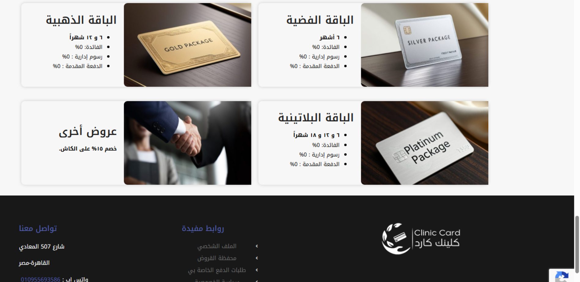 CliniCard هو موقع لخدمة تقسيط الخدمات الطبية بدون فوائد لحاملي بطاقات الائتمان من البنوك المتعاقدة، ويضم شبكة من الأطباء والمستشفيات والعيادات كمقدمي خدمات، مع عروض/باقات تقسيط منشورة بالموقع وإمكانية الاحتفاظ بنسخة من السجلات الصحية ومشاركتها عند الحاجة.