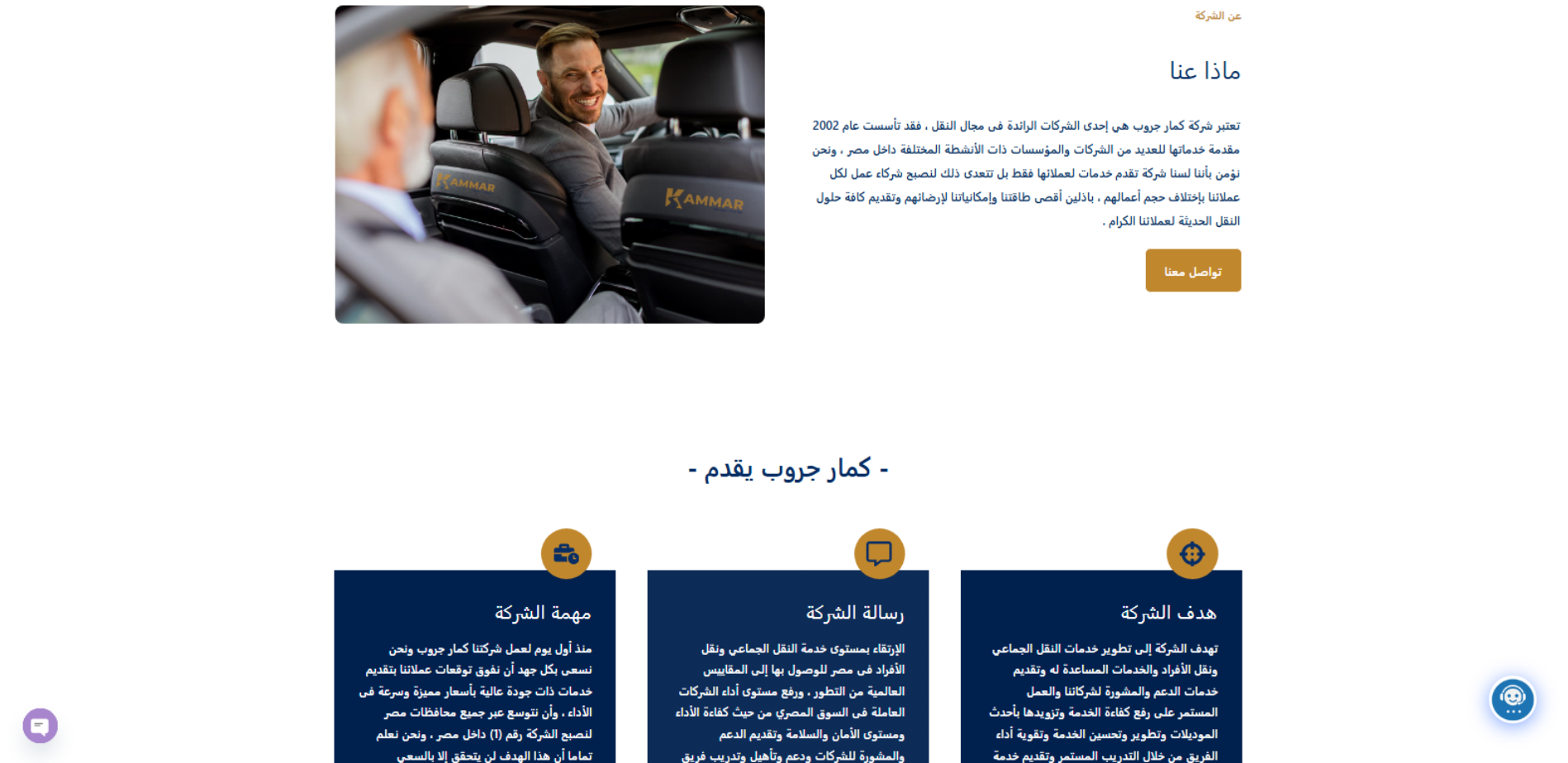 موقع كمار جروب هو الموقع التعريفي لشركة نقل تأسست عام 2002، تقدم حلول نقل داخل مصر تشمل نقل العاملين لدى الشركات وطلاب المدارس والرحلات الداخلية، إضافةً إلى خدمات نقل البضائع، مع صفحات للتعريف بالشركة والخدمات ومعرض الصور وبيانات التواصل.