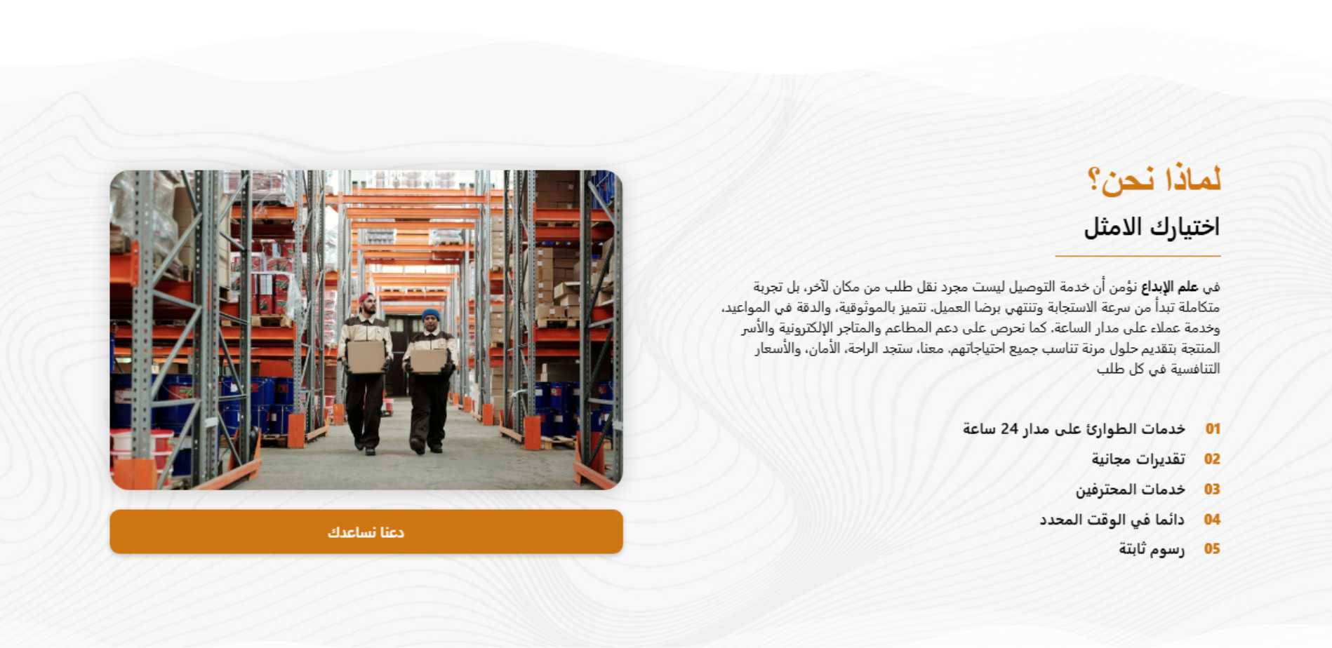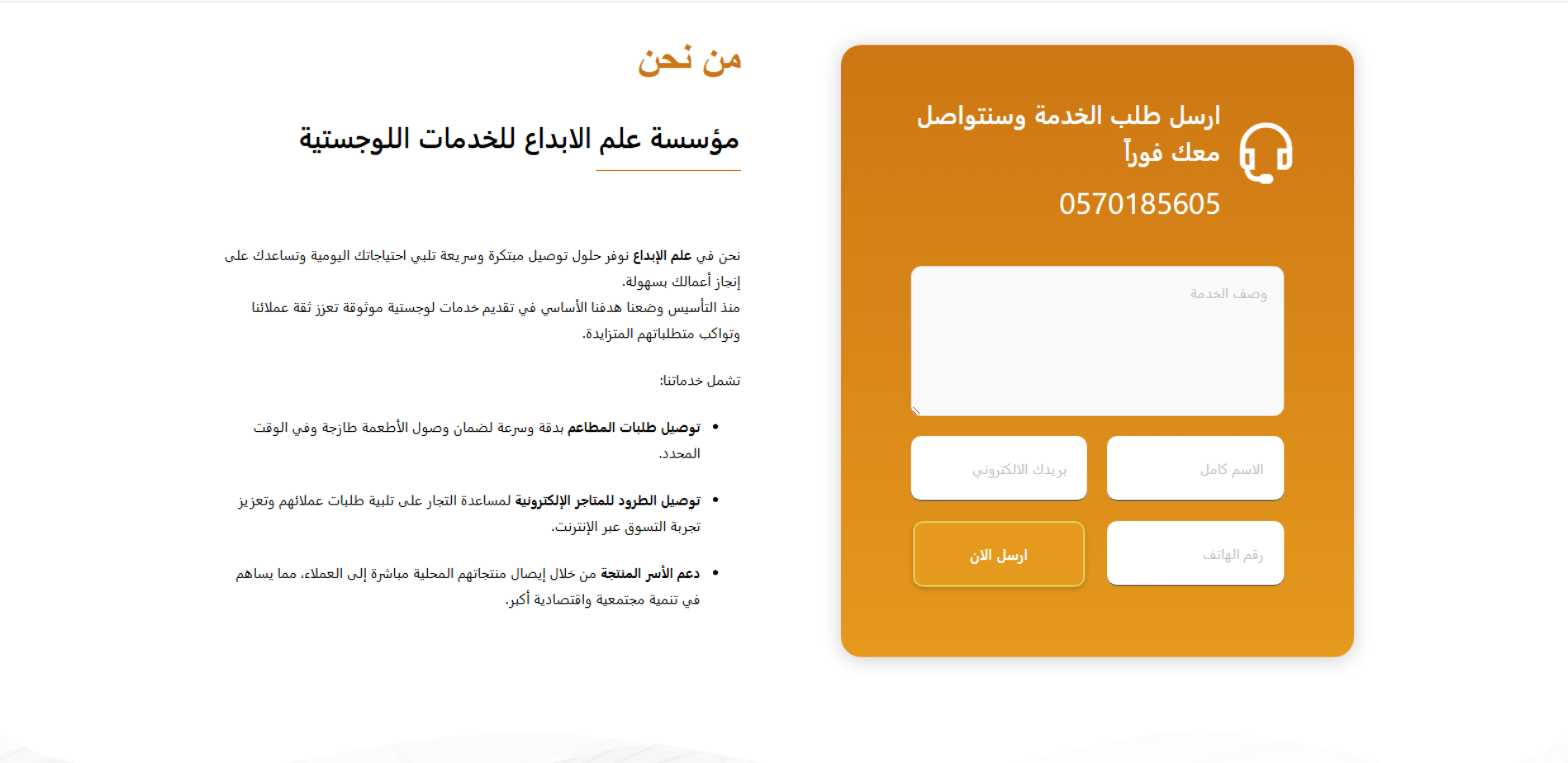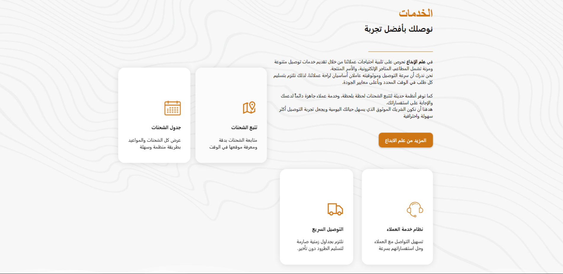 موقع مؤسسة علم الإبداع للخدمات اللوجستية يعرّف بالشركة كحل توصيل سريع وموثوق داخل السعودية، ويعرض خدماتها الأساسية لتوصيل طلبات المطاعم، شحن وتوصيل طرود المتاجر الإلكترونية، ودعم الأسر المنتجة بإيصال منتجاتهم للعملاء. كما يوضح عناصر تشغيل مهمة مثل تتبع الشحنات، جدول الشحنات، لوحة تحكم للعميل، ونظام خدمة العملاء، بالإضافة إلى صفحة تواصل تحتوي بيانات الاتصال والعنوان وروابط السياسات.