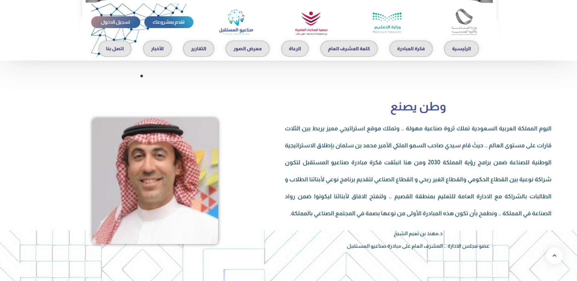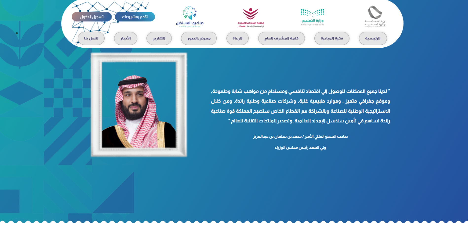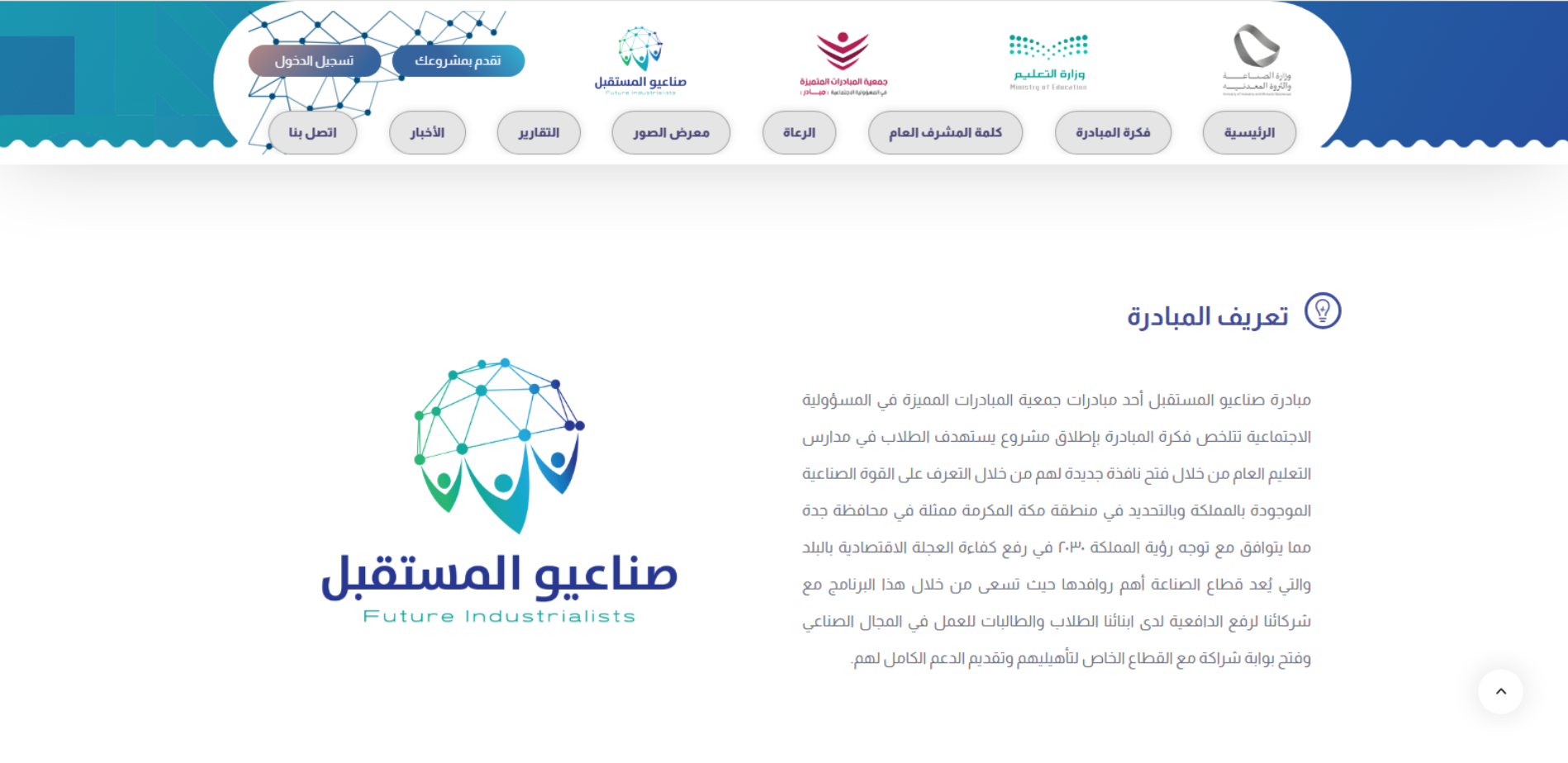 موقع صناعيو المستقبل هو بوابة لمبادرة تابعة لجمعية المبادرات المتميزة في المسؤولية الاجتماعية، تركّز على رفع دافعية الطلاب والطالبات للعمل في المجال الصناعي بما يتماشى مع رؤية السعودية 2030، من خلال التعريف بالمصانع والزيارات الصناعية، وإتاحة المشاركة في جائزة/مشاريع المبادرة عبر “تقدّم بمشروعك” وتسجيل الدخول.