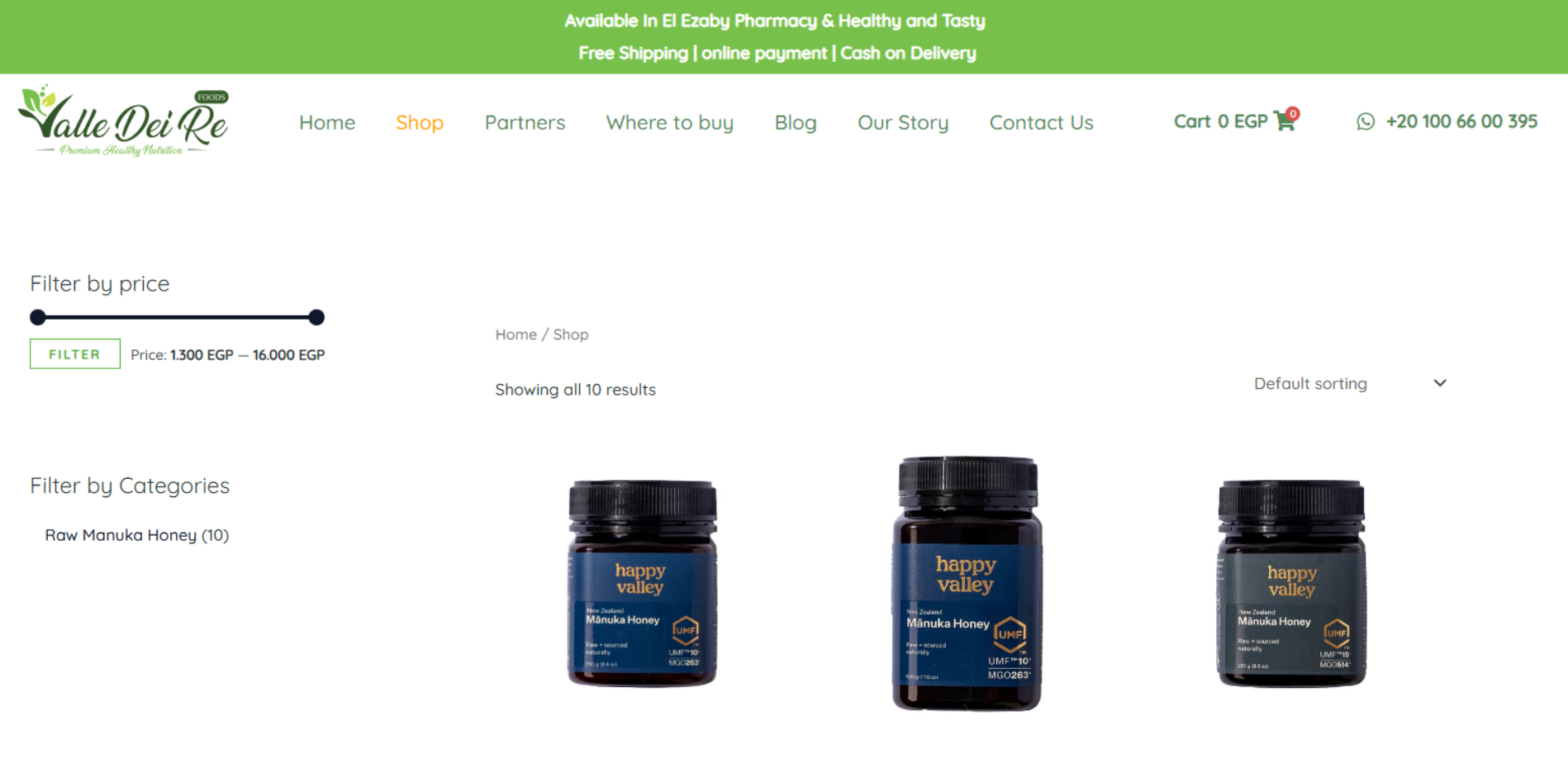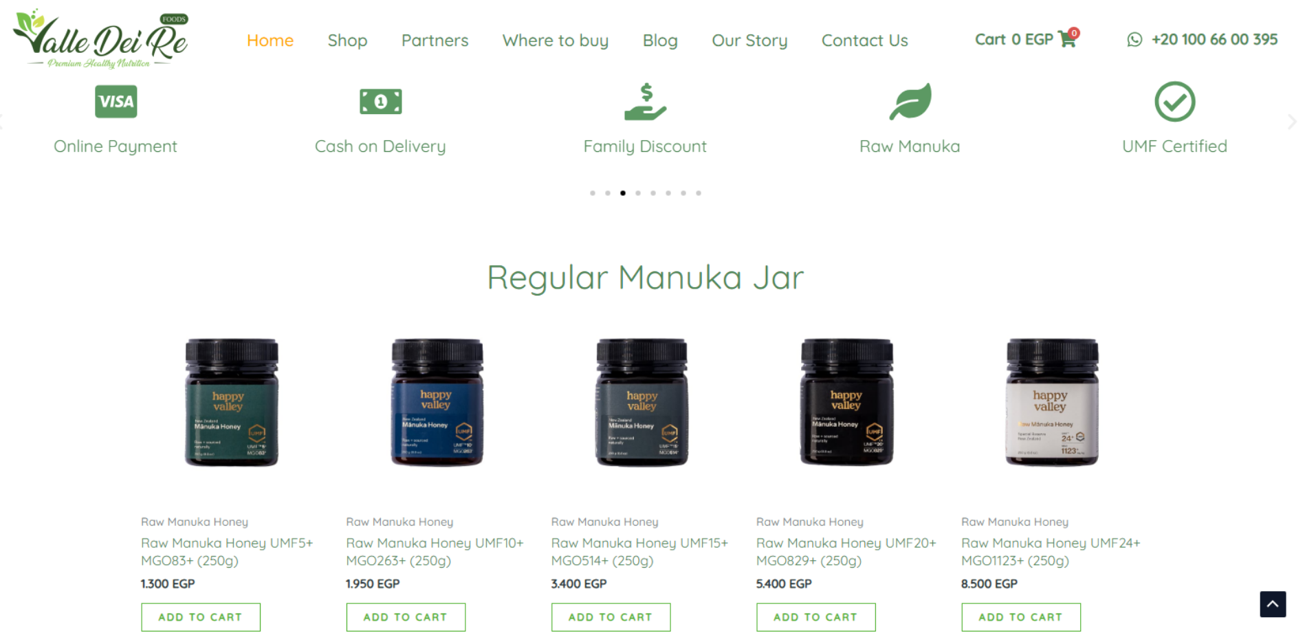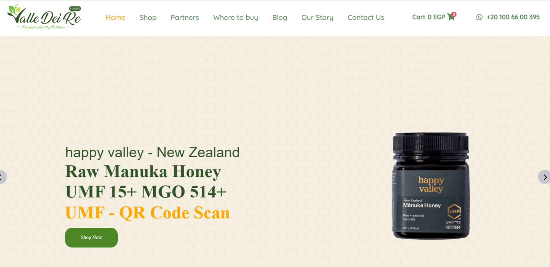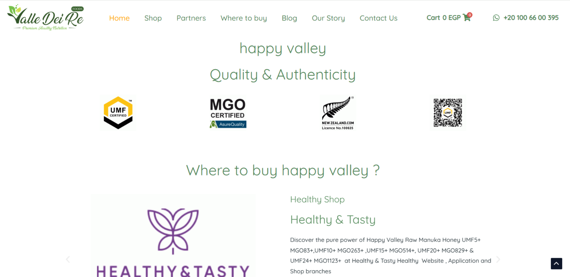 Valle Dei Re Foods جهة متخصصة في تسويق وتوزيع منتجات غذائية مميزة، ويعرض موقعها متجر Happy Valley Raw Manuka Honey (عسل مانوكا خام) بمستويات UMF/MGO المختلفة مع إمكانية الطلب أونلاين. كما يتضمن الموقع أقسامًا داعمة مثل الشركاء وأماكن الشراء والمدونة وقصة العلامة، بالإضافة إلى وسائل تواصل مباشرة (منها واتساب) وصفحات السياسات مثل الشحن والاسترجاع.