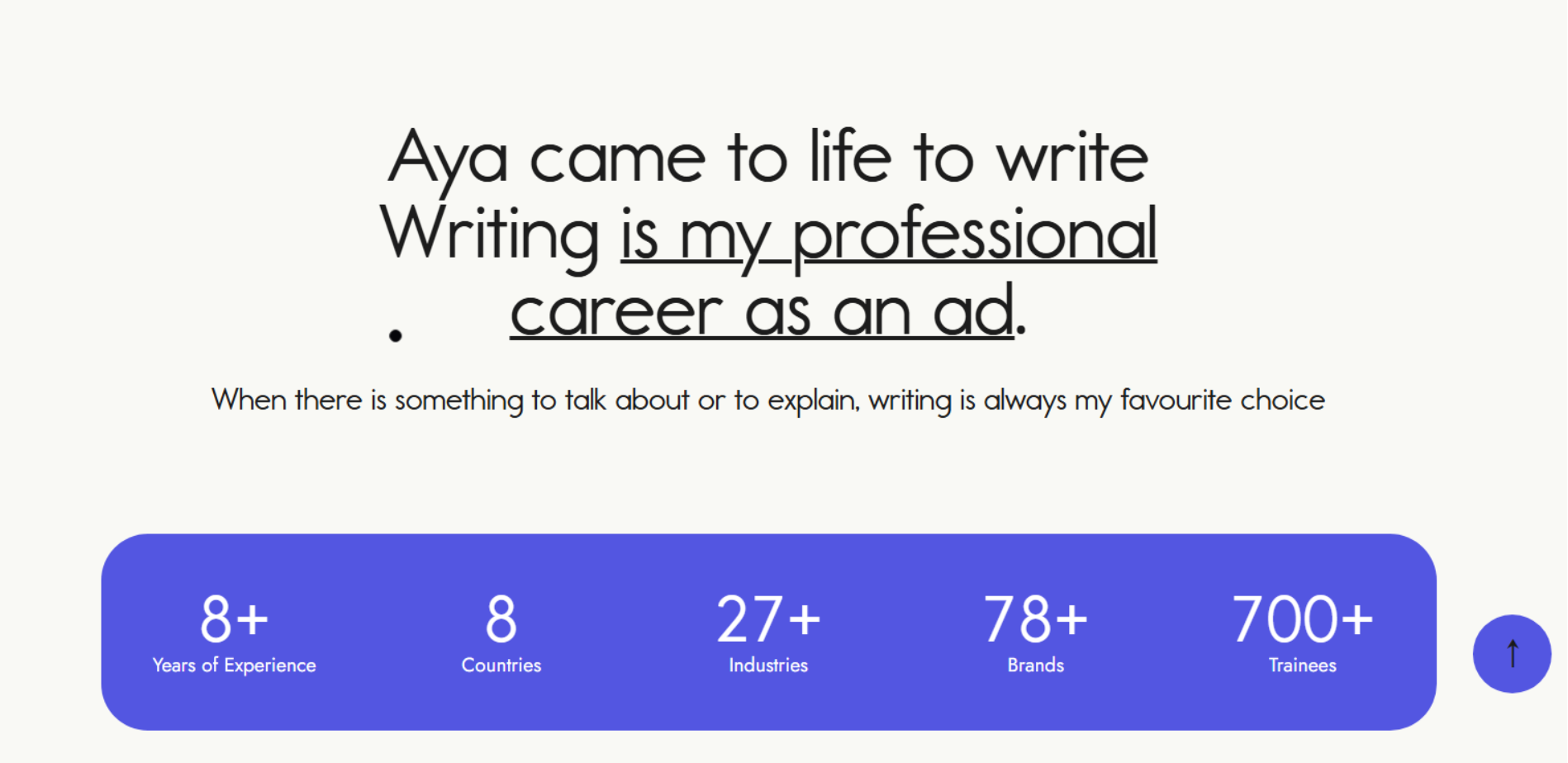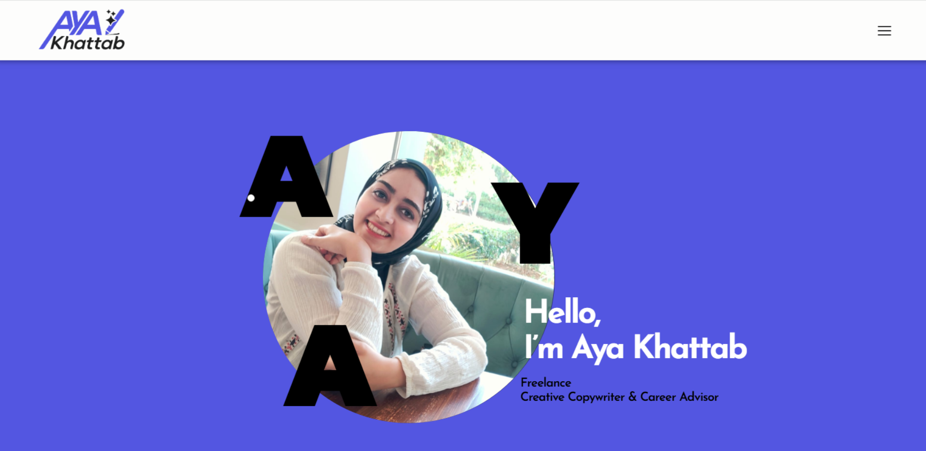 موقع Aya Khattab منصة شخصية تعرض خبرة آية في مجال صناعة المحتوى والكتابة التسويقية، وتتضمن أقسامًا واضحة مثل My Portfolio بأعمال مصنفة (Creative Campaigns / Social Media Content / Articles / Copywriting / Email Marketing / Scripts / SMS / Podcast…)، بالإضافة إلى صفحة Service للخدمات، وقسم Sharing Experience للتدريب (Online/Offline/Private/Corporate)، مع Contact للتواصل.