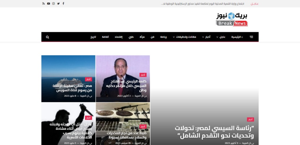 موقع Break News منصة أخبار عربية تقدّم تغطية يومية للموضوعات العامة، مع تصنيف المحتوى في أقسام واضحة مثل السياسة والاقتصاد والرياضة والفن والمرأة والطب والتاريخ. يعتمد الموقع على عرض الأخبار في شكل بطاقات وصور بارزة للعناوين الرئيسية، مع شريط تنقل وبحث لتسهيل الوصول السريع للمحتوى.