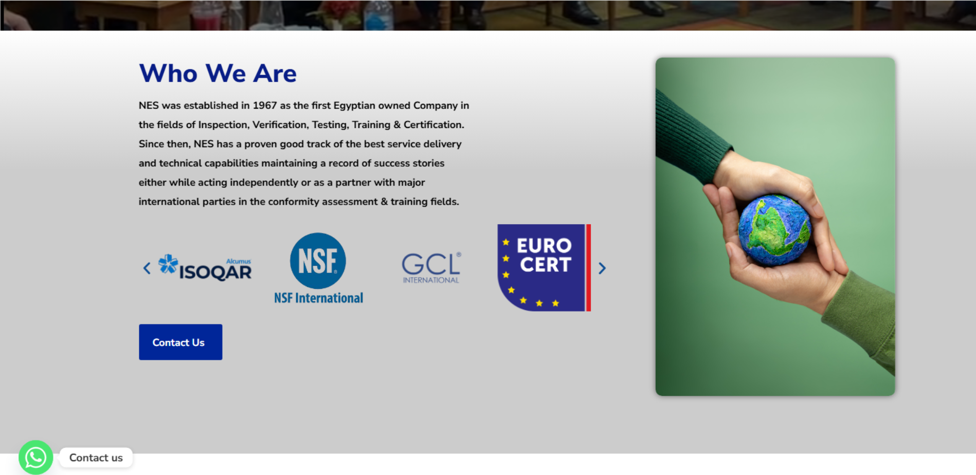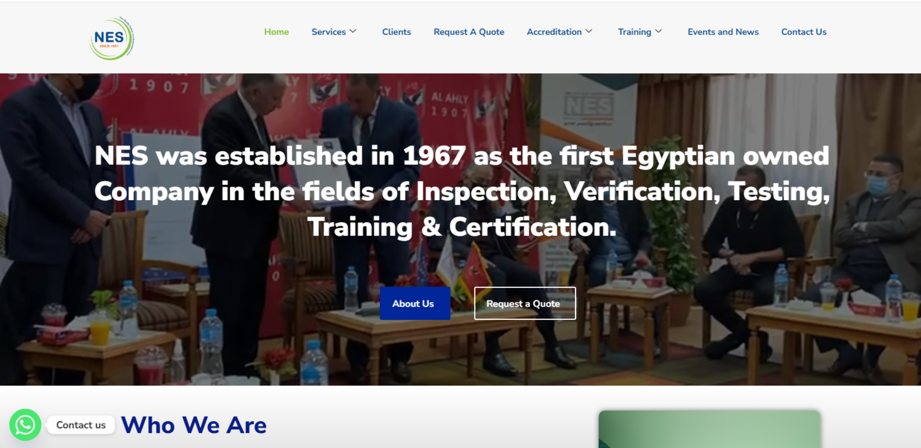 موقع NES يعرض شركة تأسست عام 1967 وتعمل في مجالات Inspection / Verification / Testing / Training / Certification. الصفحة الرئيسية تقدم نبذة عن الشركة، وأقسام خدمات واضحة، مع إمكانية طلب عرض سعر (Request a Quote)، وجدول تدريب (Training Schedule) ومحتوى/مدونة، بالإضافة إلى صفحات تواصل وفروع.