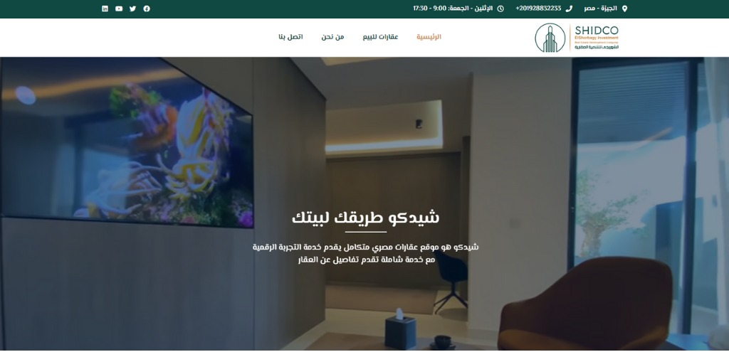 موقع شيدكو (SHIDCO) واجهة تعريفية لشركة تعمل في مجال الاستثمار العقاري داخل مصر، تركّز على عرض عقارات للبيع ضمن تجربة تصفح بسيطة. يتضمن الموقع أقسامًا أساسية مثل من نحن وعقارات للبيع واتصل بنا، مع إظهار بيانات التواصل والموقع (الجيزة) وساعات العمل، ما يساعد العملاء على الوصول للمعلومات وبدء التواصل بسهولة.