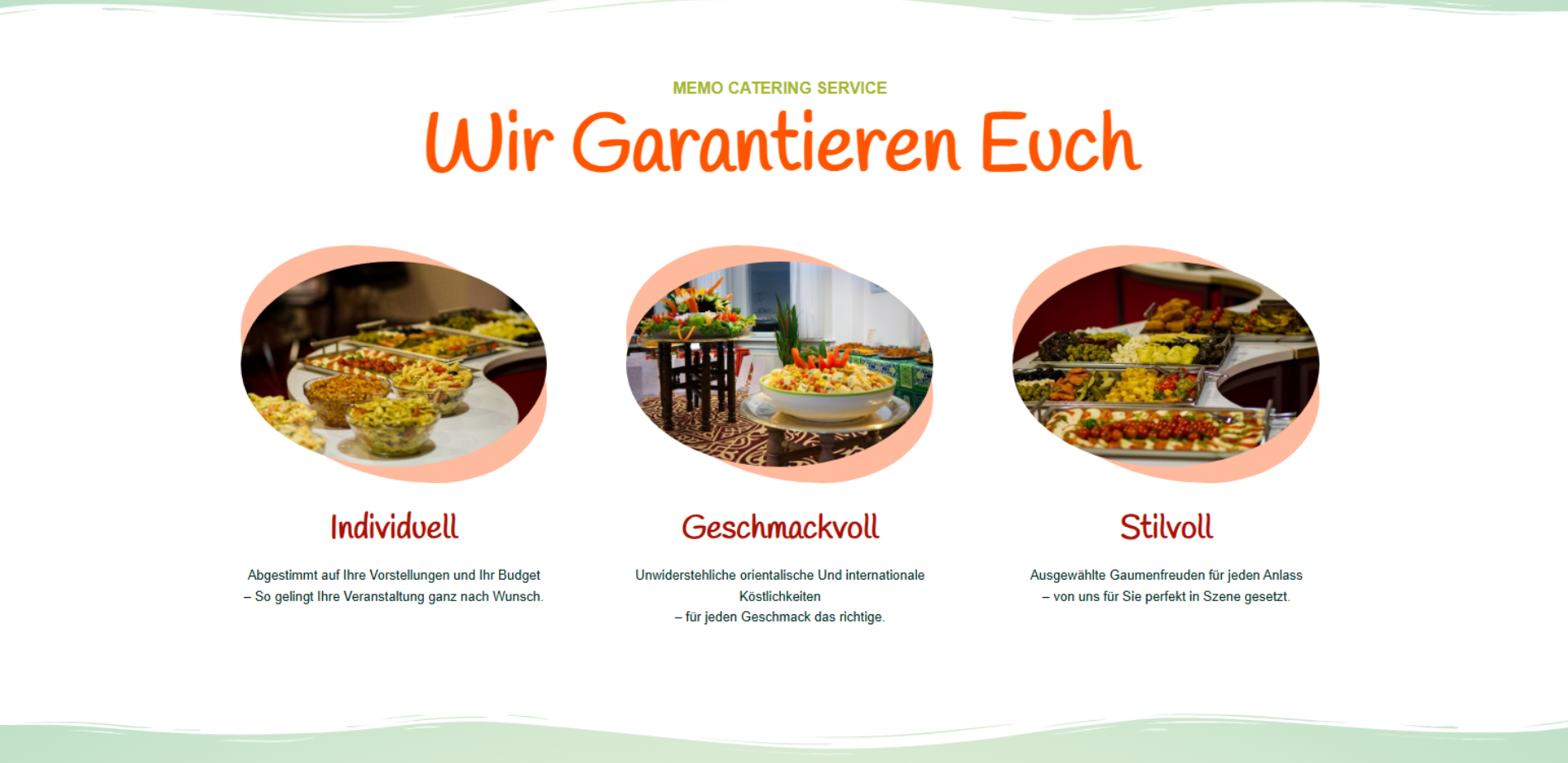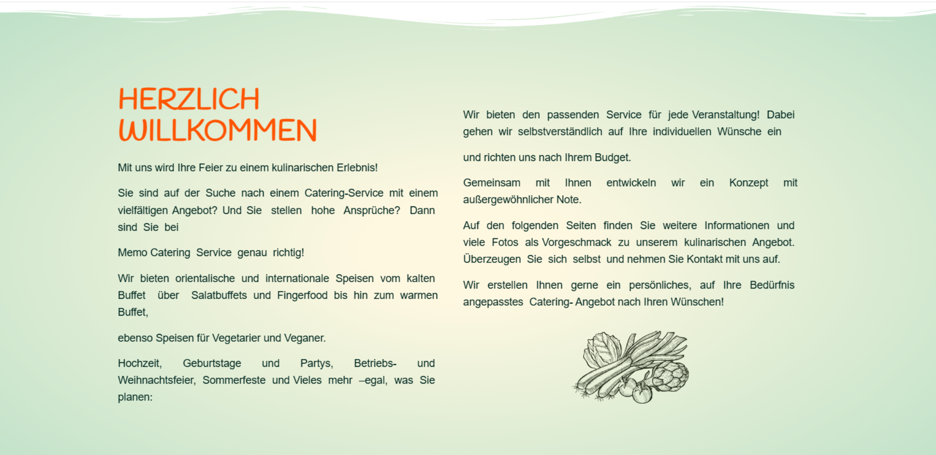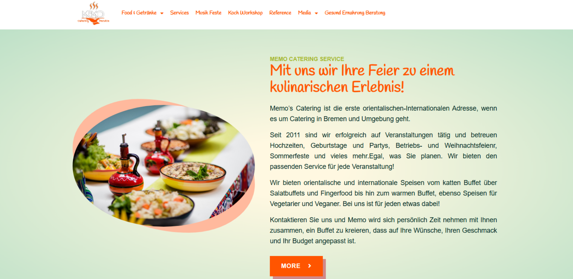 موقع Memo Catering يعرض خدمة كاترينج للمناسبات في بريمن وما حولها (منذ 2011)، ويقدّم قوائم طعام متنوعة تشمل البوفيه البارد والساخن وسلطات وفينجر فود وساندوتشات/سناكس ومشويات ومشروبات، مع توفير اختيارات للنباتيين والفيجان. يحتوي الموقع على أقسام منظمة للطعام والمشروبات بالتصنيفات، وخدمات إضافية مثل تأجير أدوات التقديم والضيافة، بالإضافة إلى صفحات للوسائط (فيديو/معرض صور/مدونة) وصفحة تواصل مباشرة.