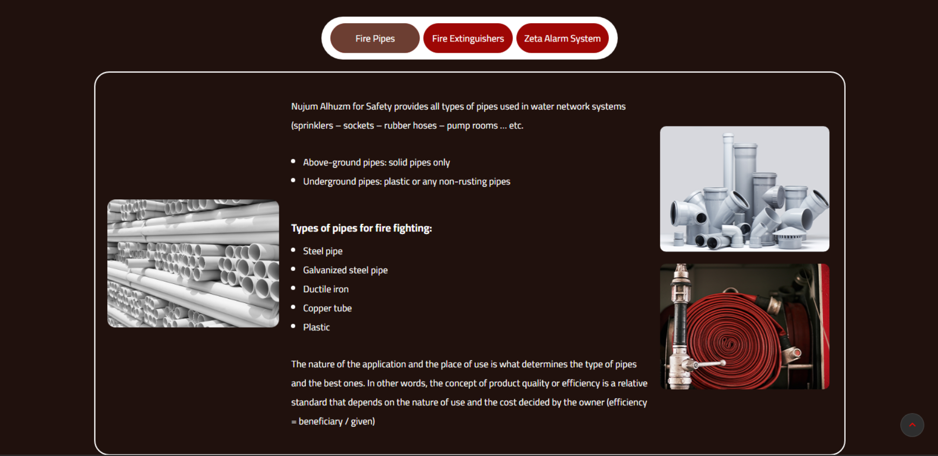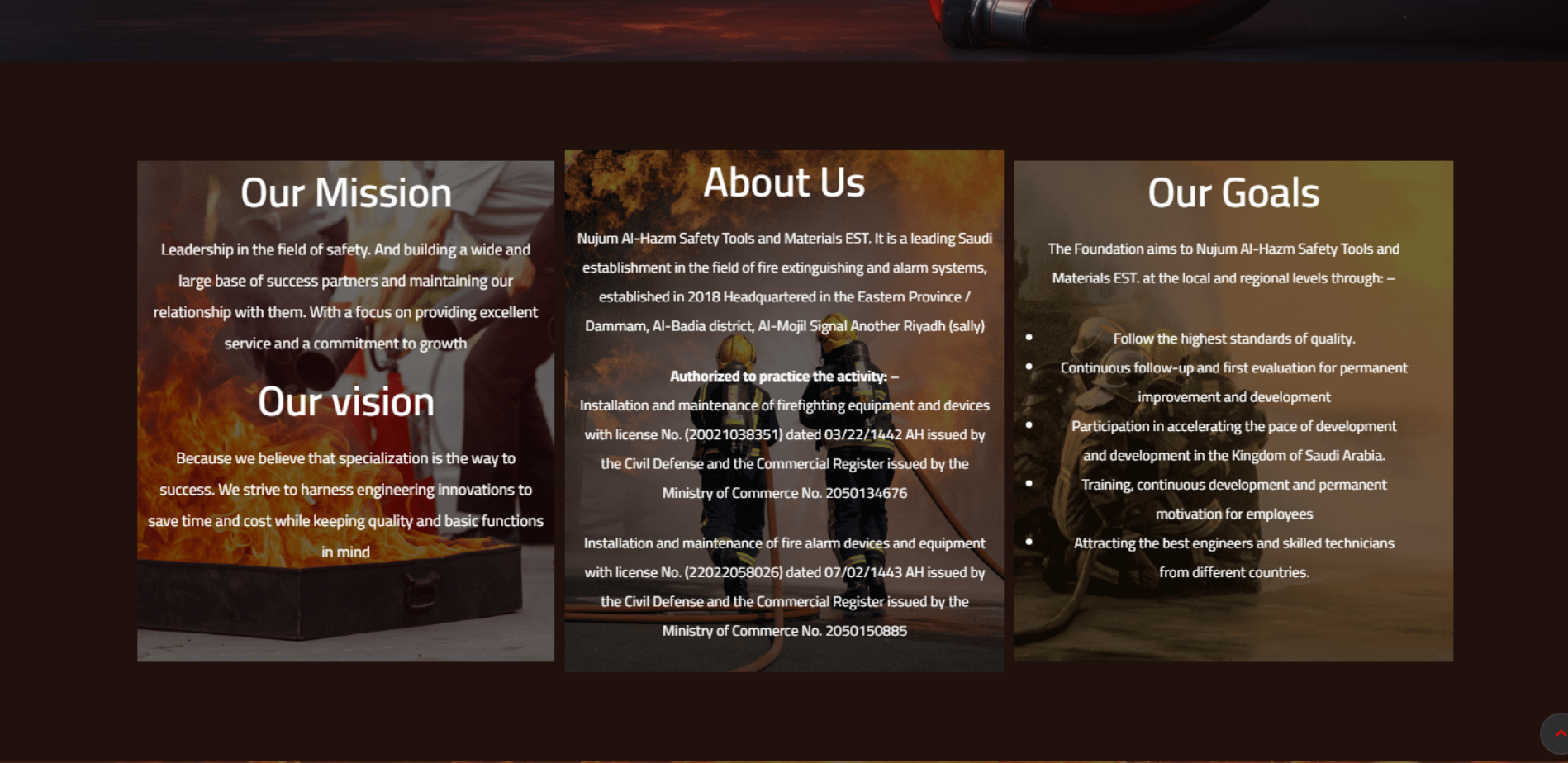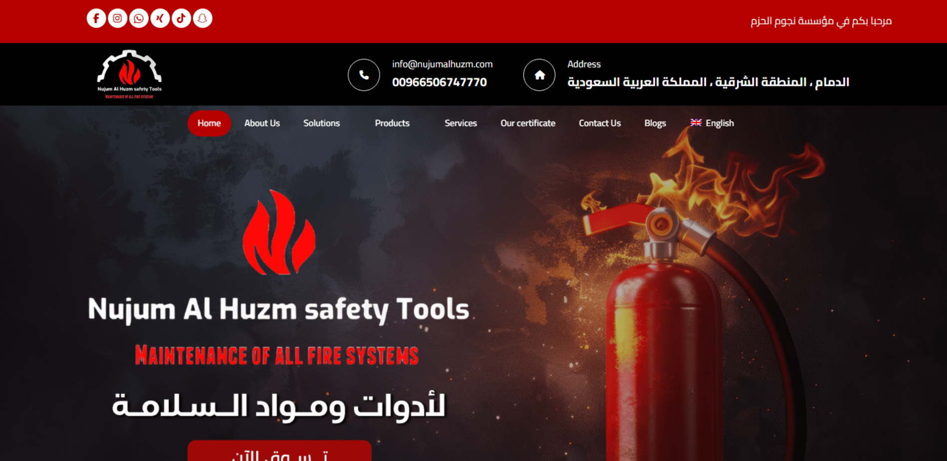 موقع تعريفي لمؤسسة سعودية متخصصة في أنظمة الإطفاء والإنذار وأدوات السلامة (تأسست 2018)، تقدم حلول مثل Fire Fighting Solutions وLow Current System وIBS Solutions، وتعرض منتجات متعددة (مخارج طوارئ مضيئة، طفايات، مواسير الحريق، أنظمة إنذار Zeta/Simplex، مضخات حريق، FM200…)، بالإضافة إلى خدمات توريد وتركيب وصيانة وعقود صيانة سنوية وتدريب العاملين، مع بيانات التواصل.
