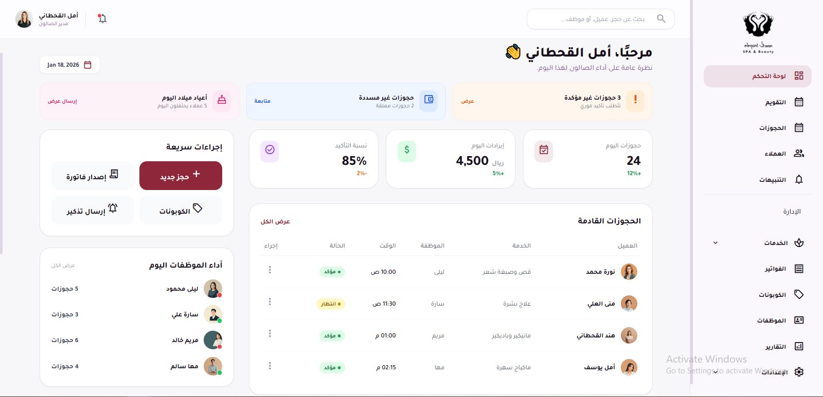نظام إدارة للصالونات ومراكز التجميل يوفّر لوحة تحكم تعرض نظرة عامة على أداء اليوم، مثل عدد الحجوزات، إيرادات اليوم، ونسبة تأكيد الحجوزات، مع تنبيهات للحجوزات غير المؤكدة أو التي تحتاج متابعة. يتيح تنفيذ إجراءات سريعة مباشرة من الداشبورد مثل حجز جديد، إصدار فاتورة، إرسال تذكير، وإدارة الكوبونات.