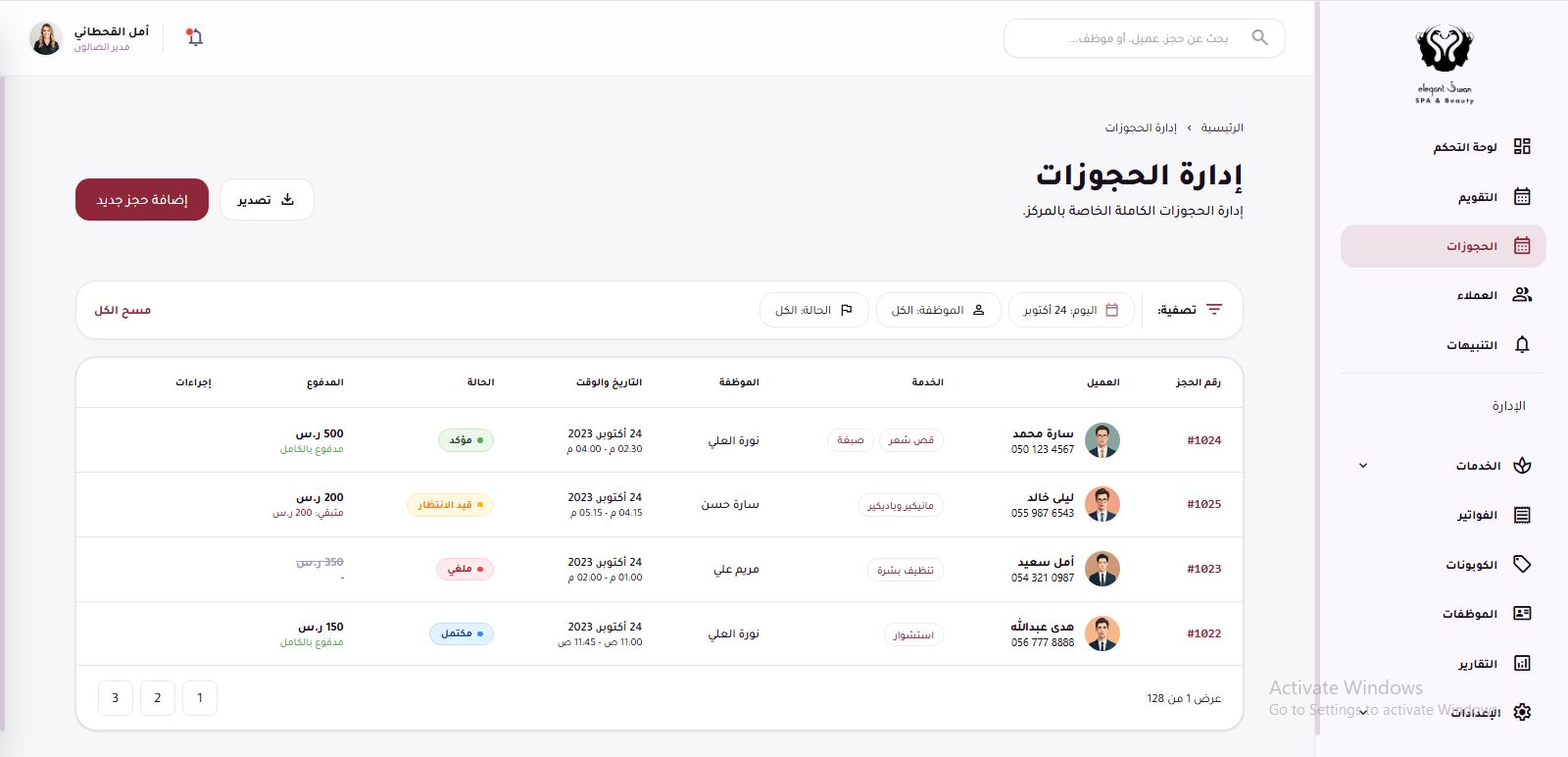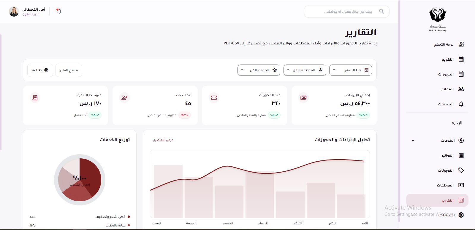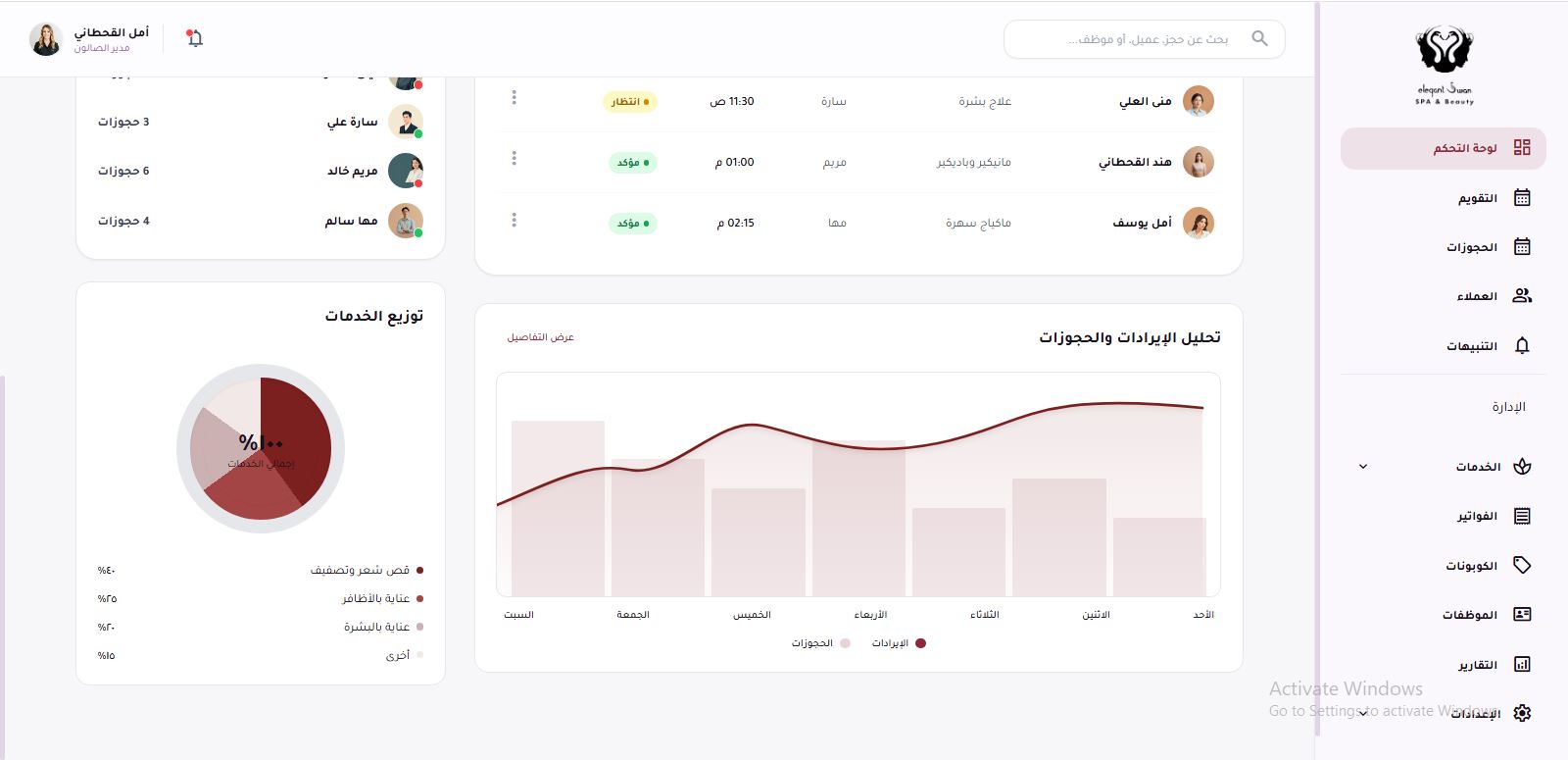 يشمل النظام جدولًا للحجوزات القادمة يعرض تفاصيل كل حجز (العميل، الخدمة، الموظفة/الموظف، الوقت، حالة الحجز مثل مؤكد/انتظار) مع إمكانية إدارة الحجز من نفس القائمة. كما يعرض قسمًا لقياس أداء الموظفين اليومي بعدد الحجوزات لكل موظف، بالإضافة إلى تقارير مرئية مثل توزيع الخدمات (Pie Chart) وتحليل الإيرادات والحجوزات خلال أيام الأسبوع (Line/Bar Chart).