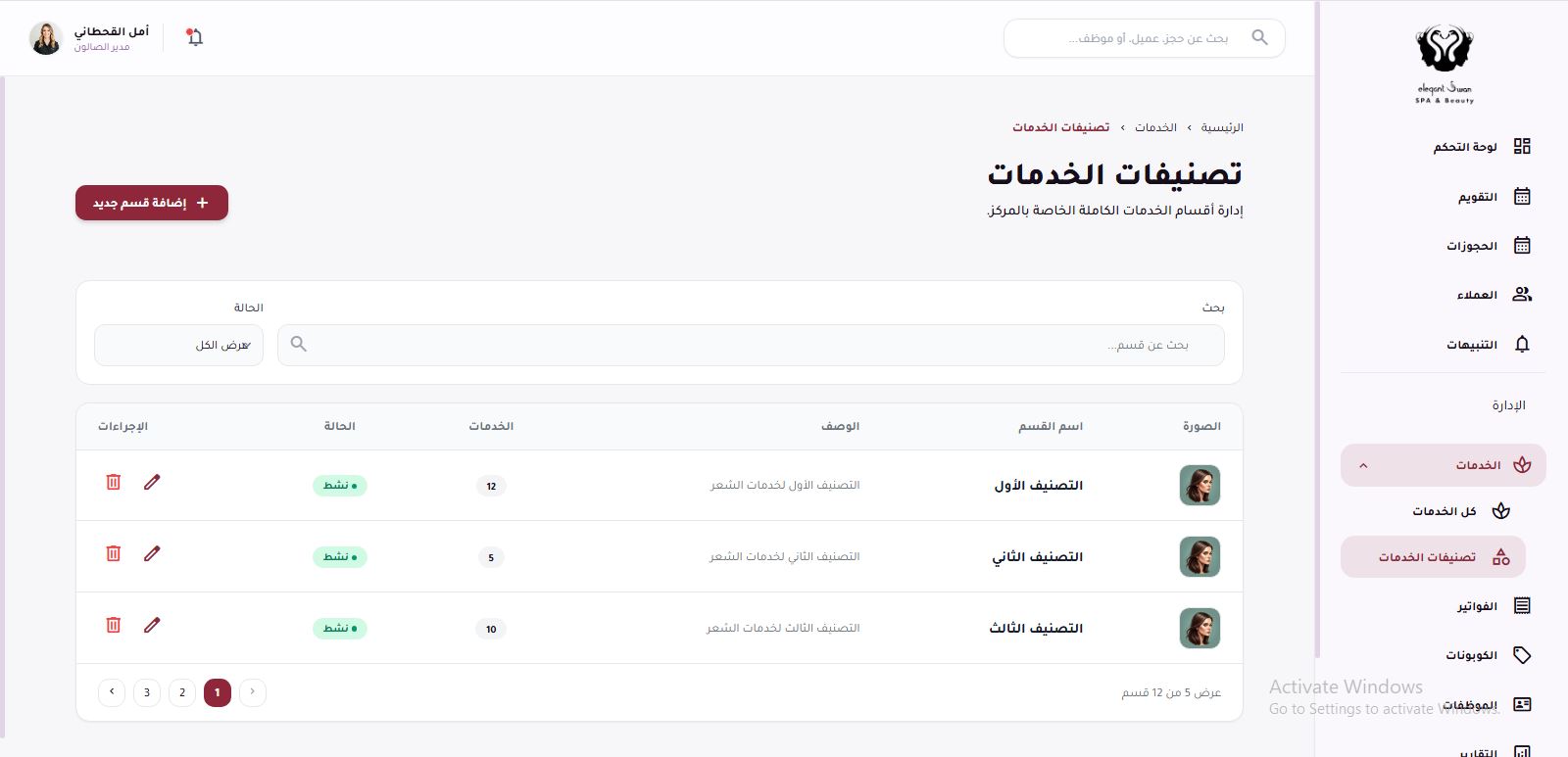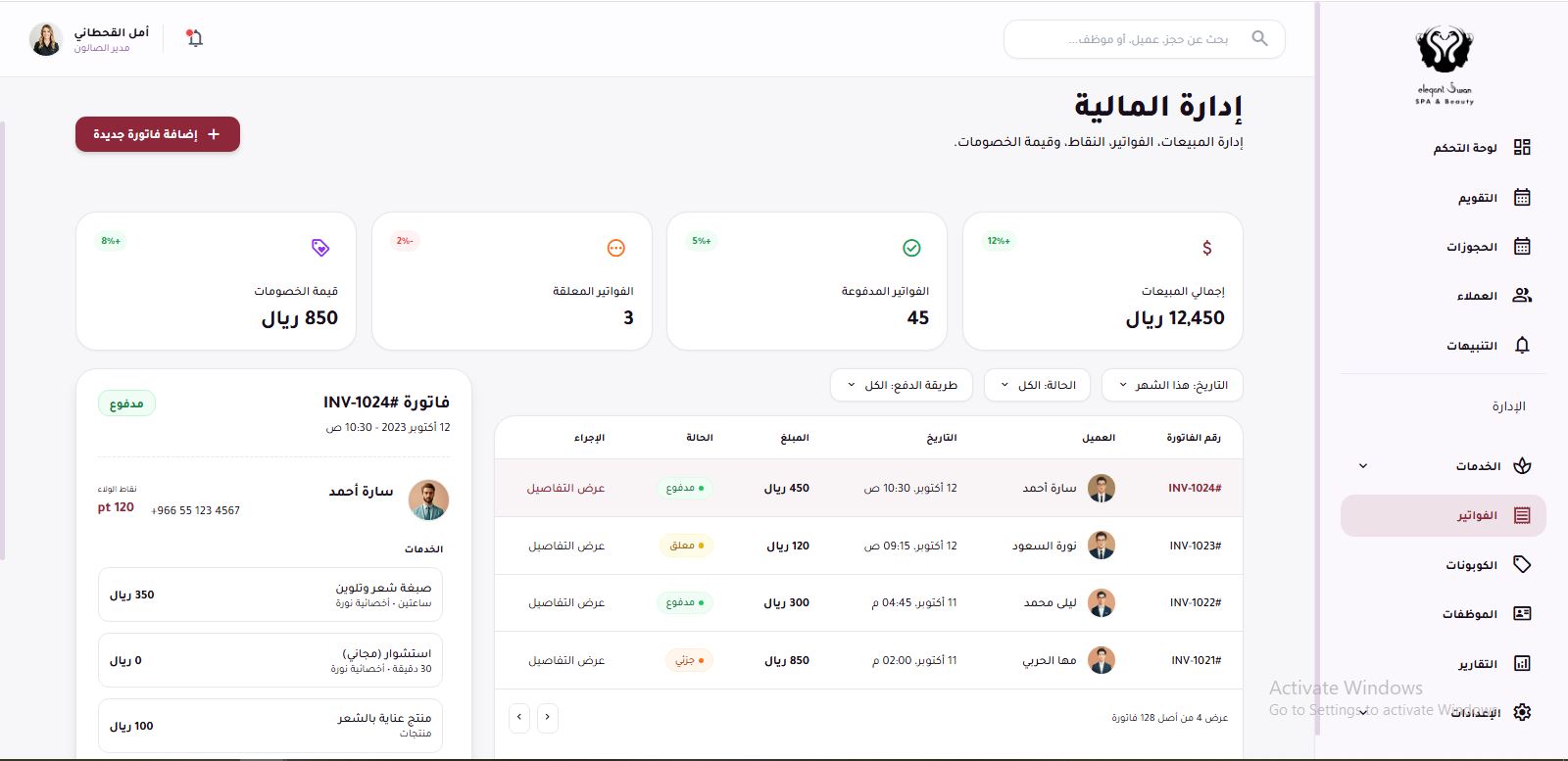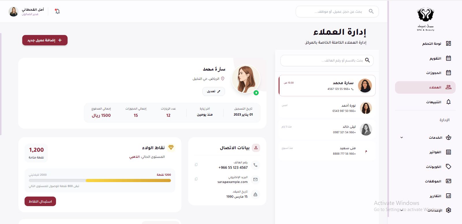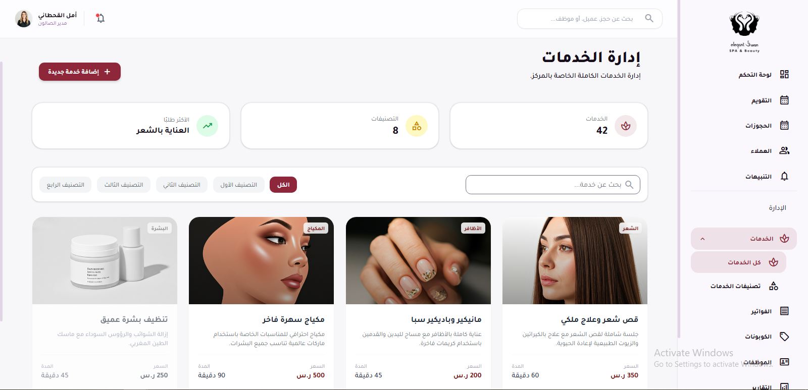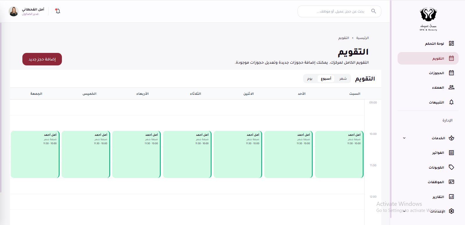 القائمة الجانبية توضح وحدات تشغيل أساسية مثل التقويم/المواعيد، الحجوزات، العملاء، التنبيهات، ووحدات الإدارة مثل الخدمات، الفواتير، الكوبونات، الموظفون، التقارير، الإعدادات.