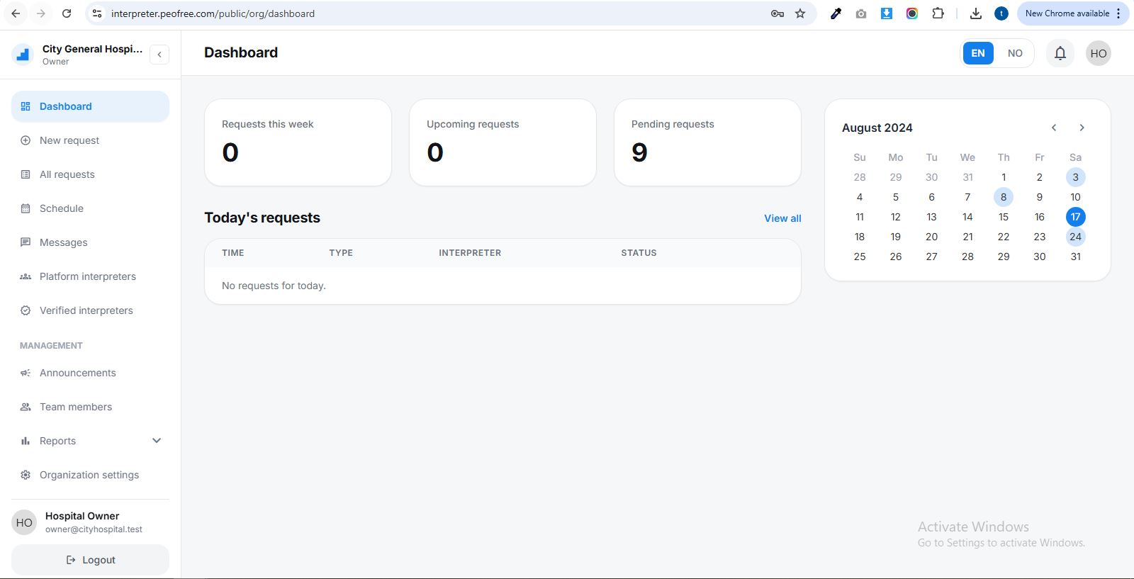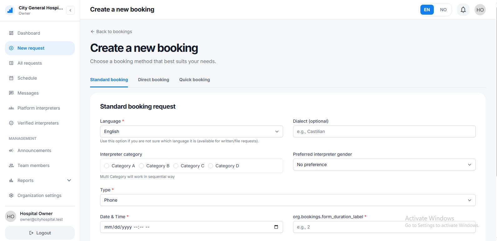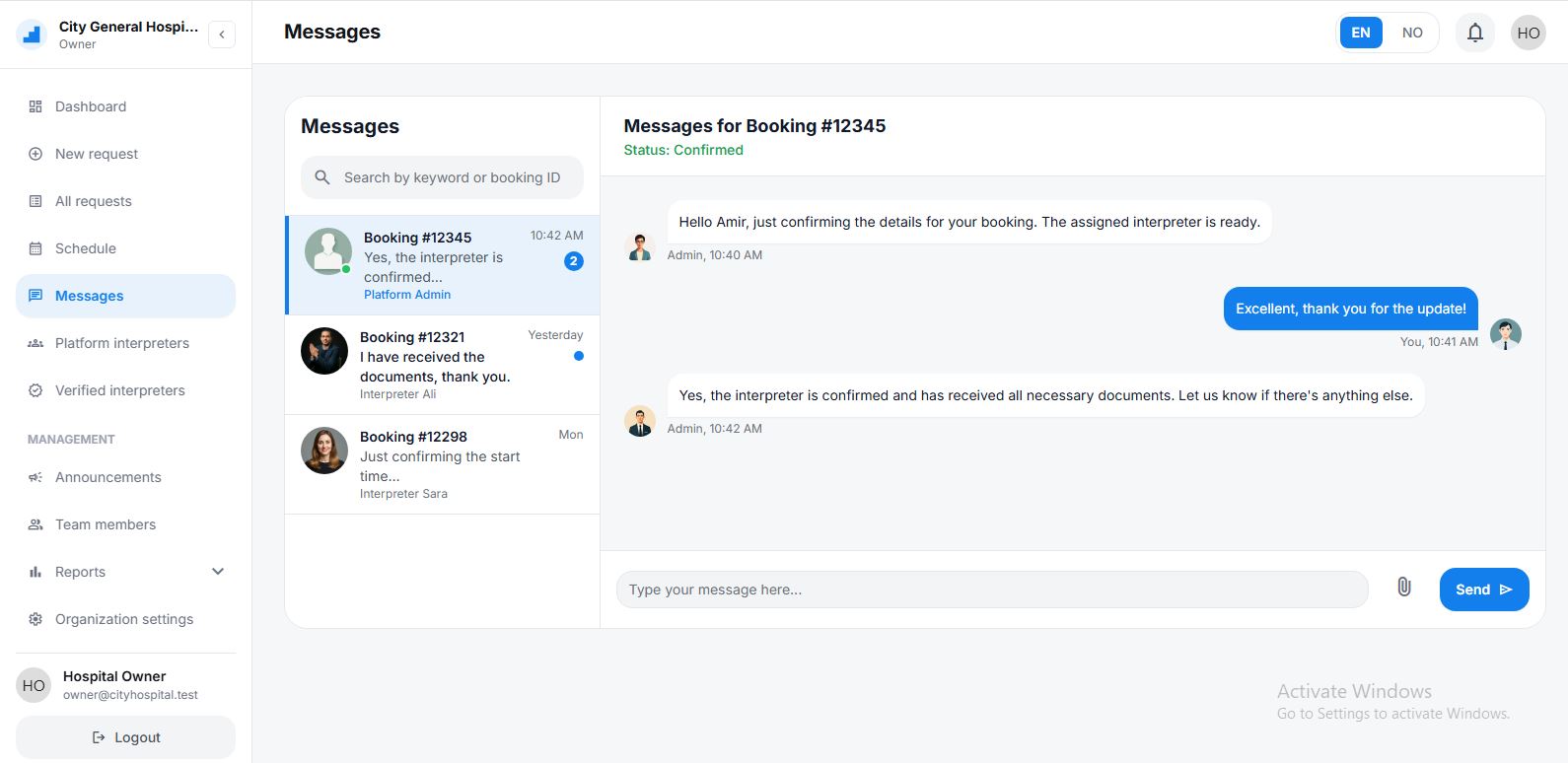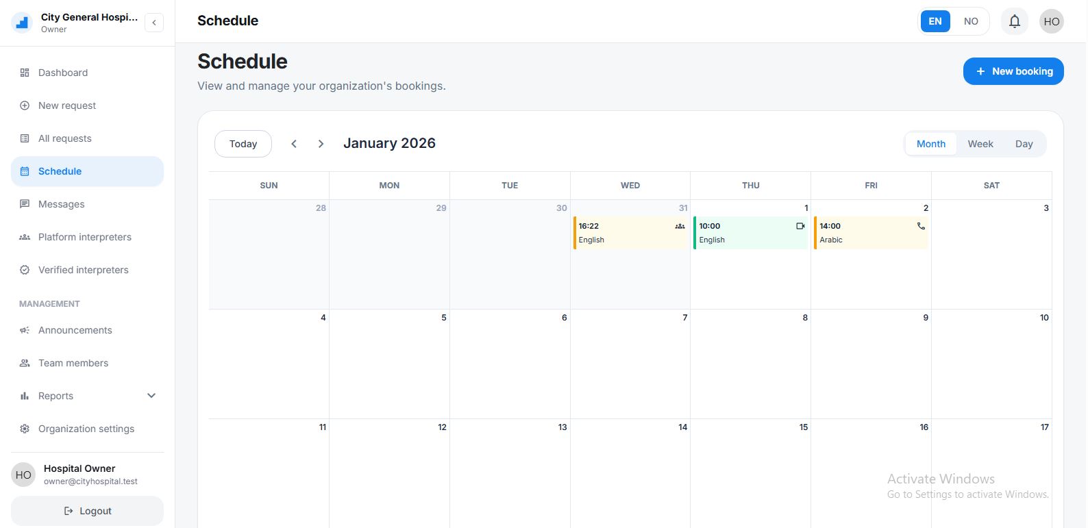 لوحة ويب متعددة الصفحات تُمكّن المؤسسة من إدارة دورة الحجز لخدمات الترجمة داخل المنصة، بداية من إنشاء الطلب وتحديد تفاصيله (لغة/لهجة/تصنيف مترجم/نوع الحجز/الوقت/المدة)، مرورًا بـ الجدولة والمتابعة، ثم التواصل التشغيلي عبر رسائل مرتبطة بالحجز، وصولًا إلى لوحة تقارير تلخص الأداء والساعات والإنفاق (Committed vs Billed) خلال فترة محددة.