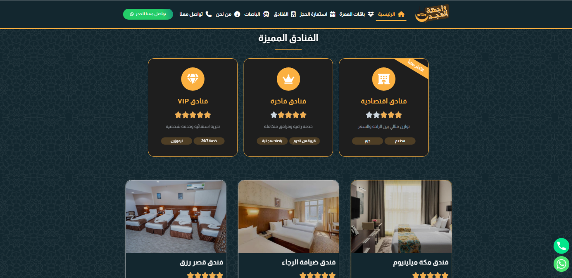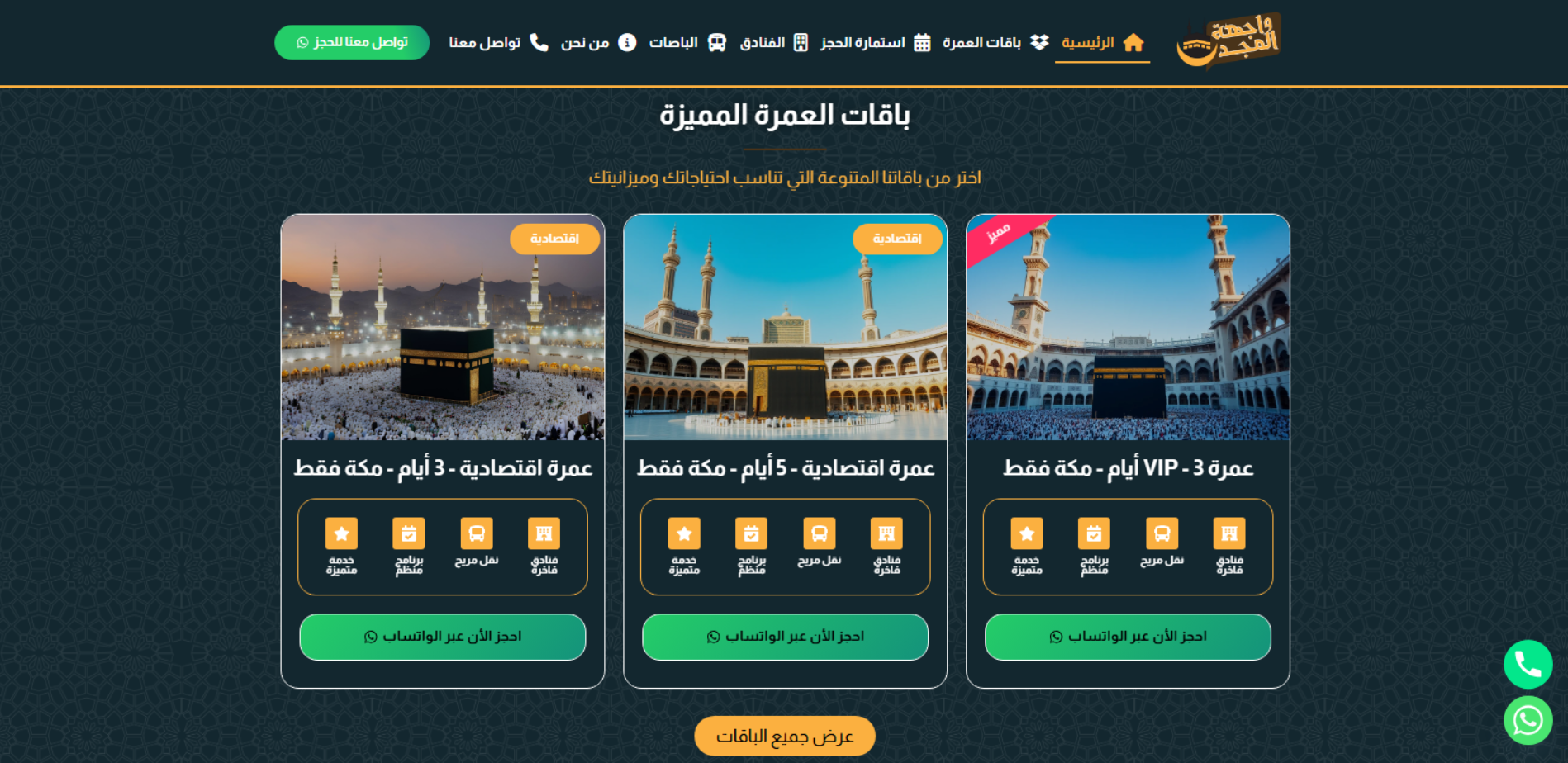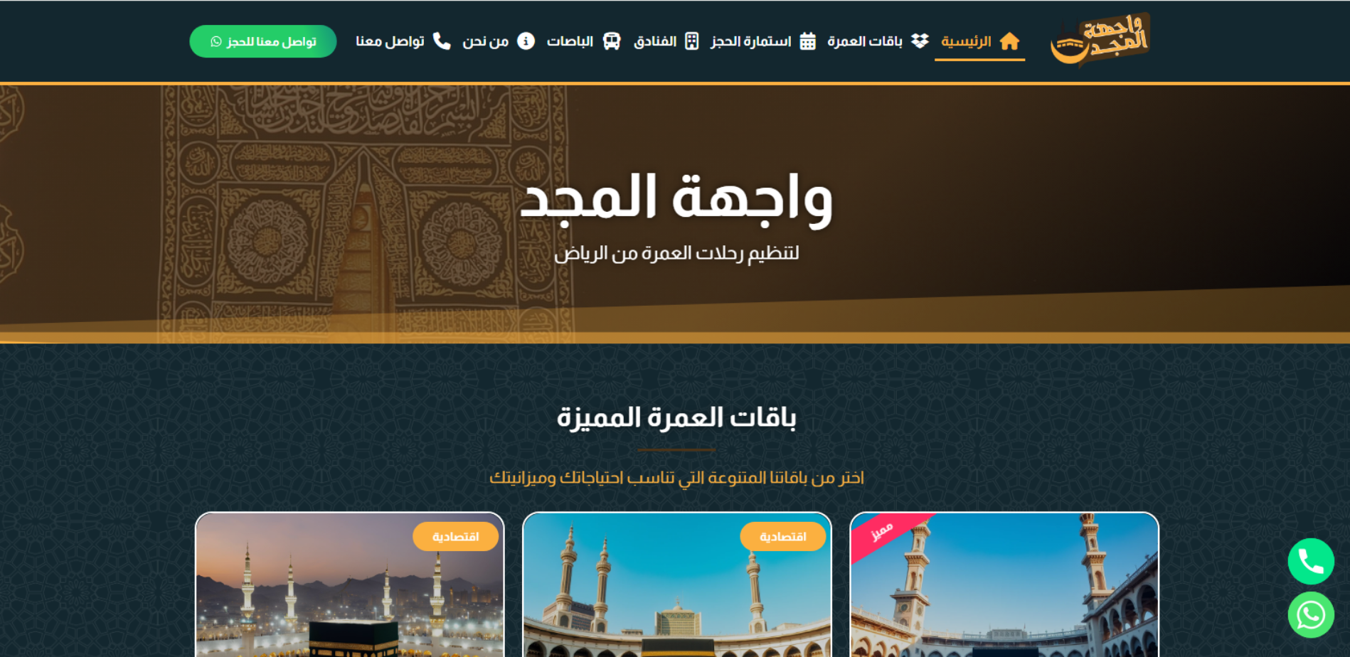 موقع واجهة المجد يقدّم تعريفًا بخدمة تنظيم رحلات العمرة المنطلقة من الرياض، ويعرض باقات متعددة بمدد مختلفة (مثل 3 أيام أو 5 أيام، وباقات مكة فقط أو مكة والمدينة) مع تفاصيل عامة عن مستوى الإقامة والتنقل. كما يحتوي على أقسام مخصصة لعرض الفنادق مع خيارات تصفية (المدينة/التصنيف)، وقسم الباصات، بالإضافة إلى استمارة الحجز وصفحة “من نحن” و“تواصل معنا” التي تتضمن بيانات الاتصال وساعات العمل.