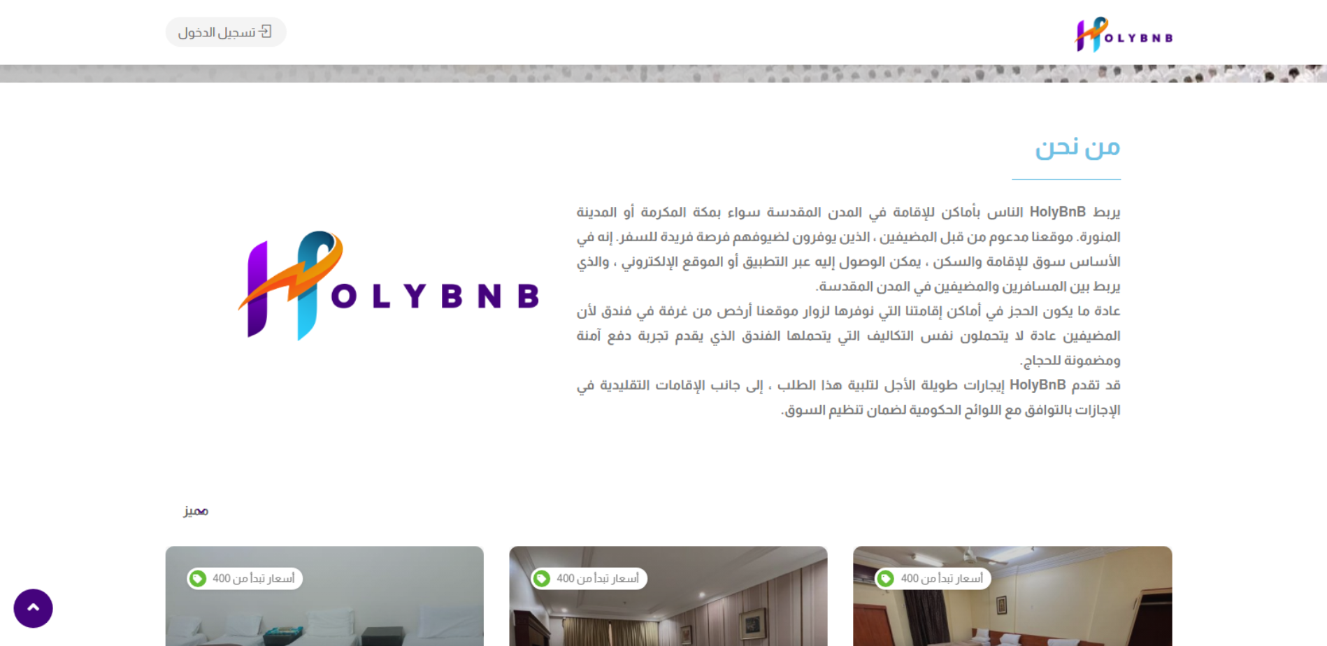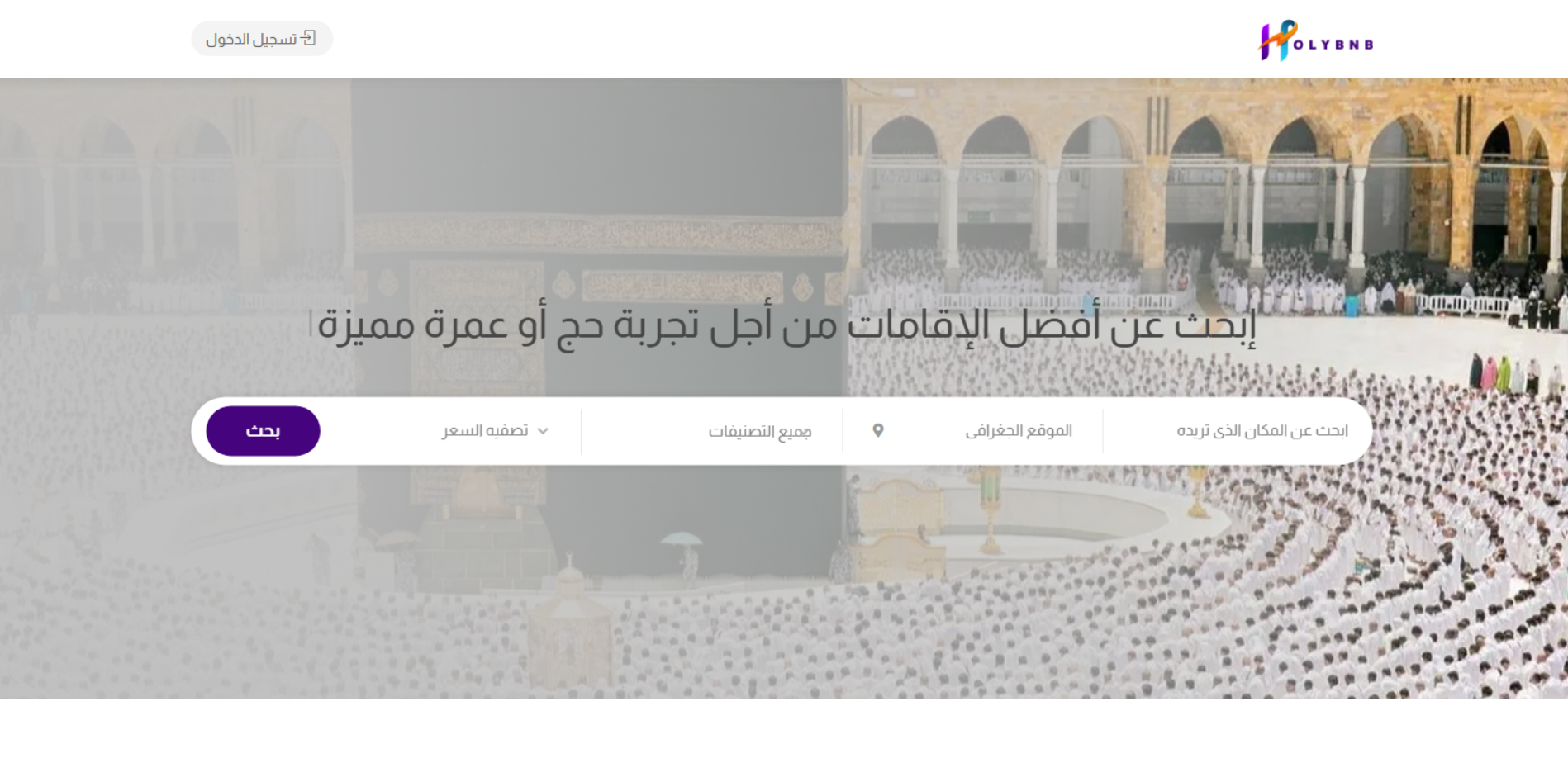 Holybnb منصة إقامة (Marketplace) مخصصة للمدن المقدسة مكة المكرمة والمدينة المنورة؛ تربط بين الضيوف والمضيفين لعرض الشقق/الإقامات والحجز عبر الموقع، وتذكر أن أسعارها قد تكون أقل من الفنادق مع تجربة دفع آمنة للحجاج.