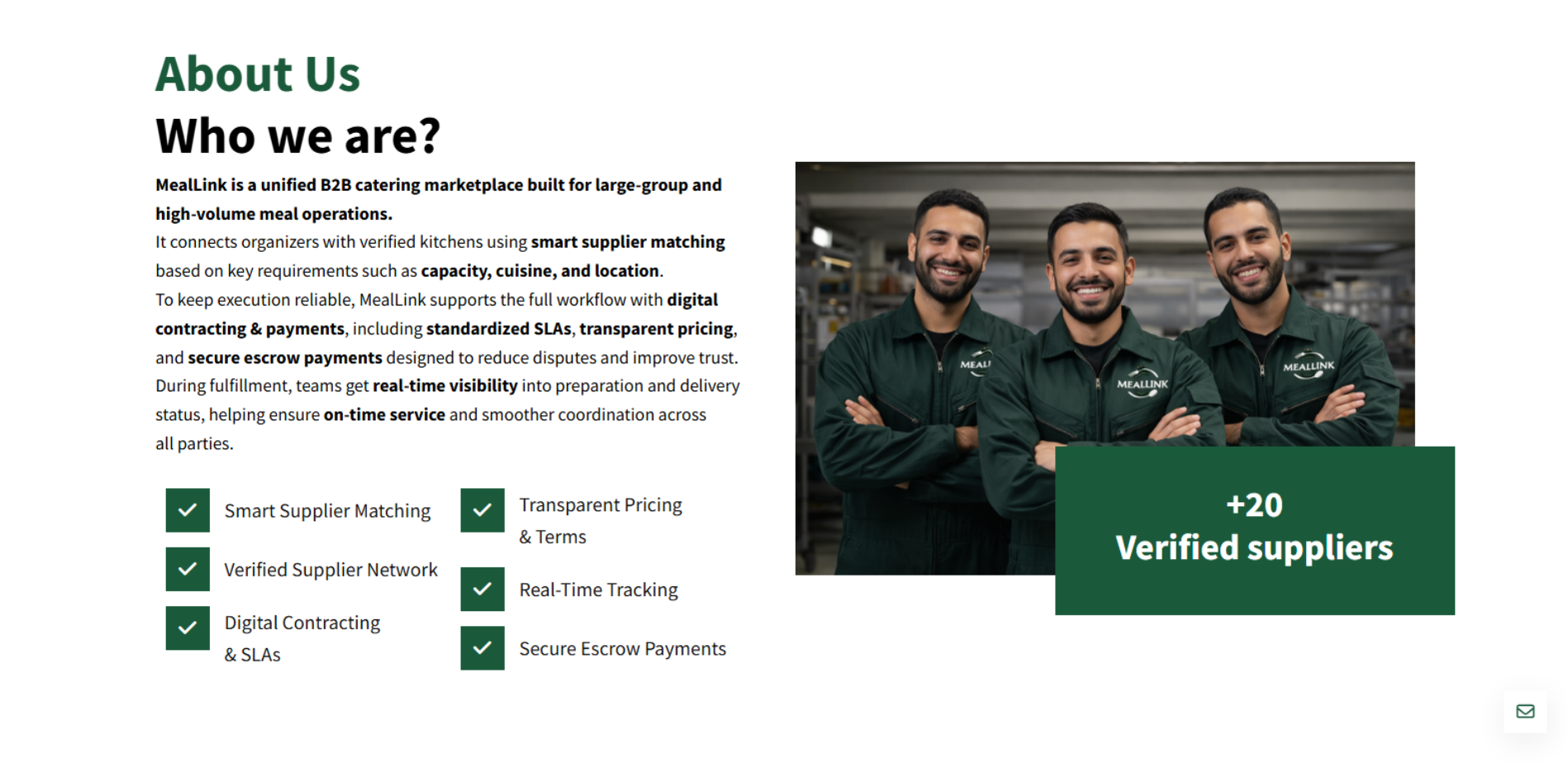 موقع MealLink يعرّف بمنصة سوق تموين B2B موجهة لطلبات الوجبات ذات الحجم الكبير (Mass Catering). المنصة تساعد منظمي الفعاليات/الشركات على اختيار المورد المناسب حسب الطاقة الإنتاجية ونوع المطبخ والموقع، ثم إدارة العملية بالكامل من خلال SLAs وتعاقدات رقمية وتسعير واضح ومدفوعات Escrow لتقليل النزاعات، مع رؤية لحظية لحالة التجهيز والتوصيل لضمان الالتزام بالوقت.