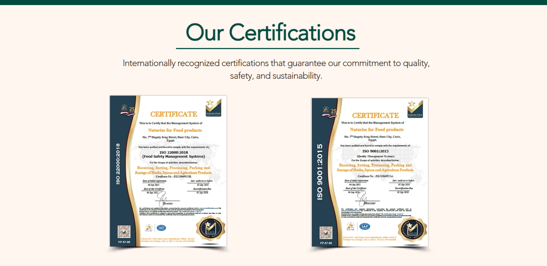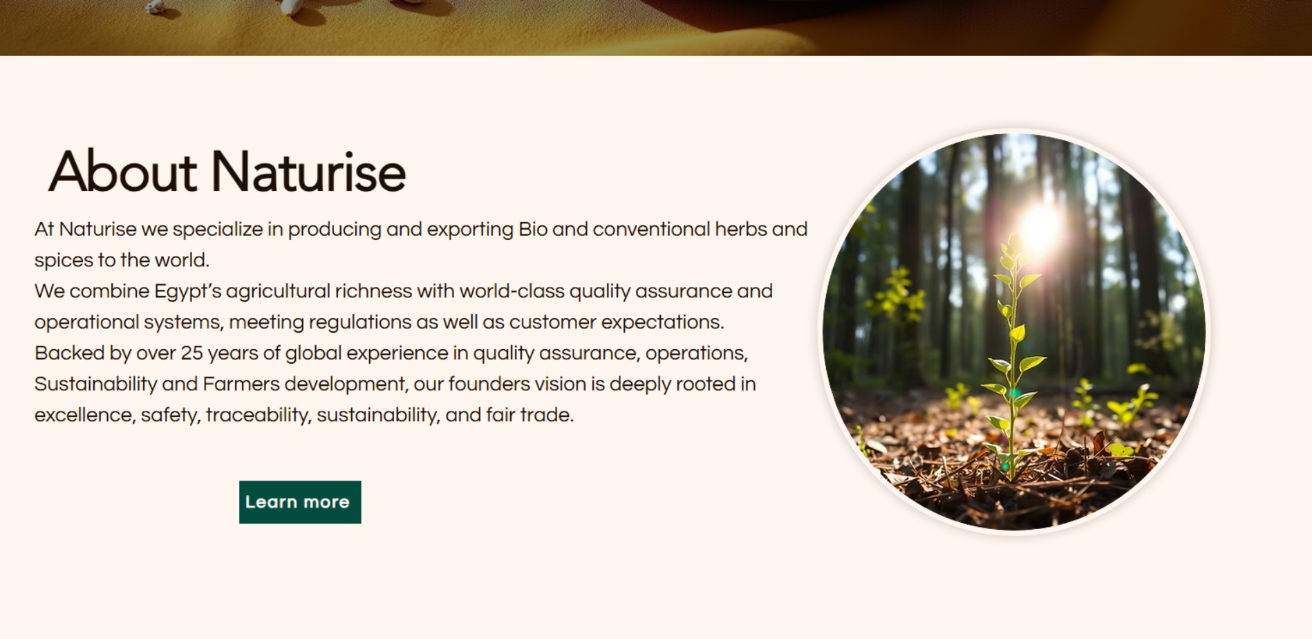 موقع Naturise HS يعرض الشركة كمُصدر دولي للأعشاب والتوابل من مصر، ويبرز أنها تصدّر منتجات عضوية وتقليدية، مع تقسيم واضح لـ Product Range (أعشاب / بذور / زهور)، وقسم يوضح سلسلة الإمداد (Supply Chain) من اختيار المزارع وحتى التسليم. كما يحتوي على جزء مخصص للاعتمادات (مثل ISO وGlobalGAP وشهادات عضوية) مع ذكر وجود تدقيق/مراجعة اعتماد بتاريخ 15 أكتوبر 2025. الموقع يضم أيضًا Gallery وSustainability وContact.